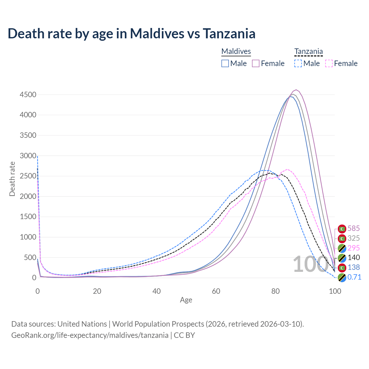 In Maldives, the most common age of death is 86, compared to 0 in Tanzania. The median age of death is 83.8 in Maldives and 72.6 in Tanzania, meaning only half of each cohort is expected to live past that age.