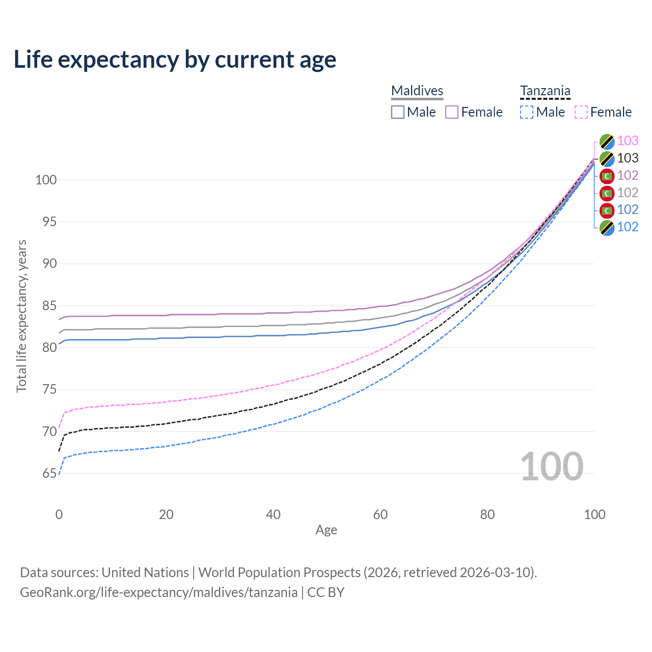 The average life expectancy at birth is 81.7 years in Maldives vs 67.6 in Tanzania. Maldives is ranked 37/197 by life expectancy, and Tanzania is 155/197. In Maldives, the life expectancy is 80.4 years for males and 83.3 years for females. In Tanzania, it's 64.8 years for males and 70.4 years for females.
