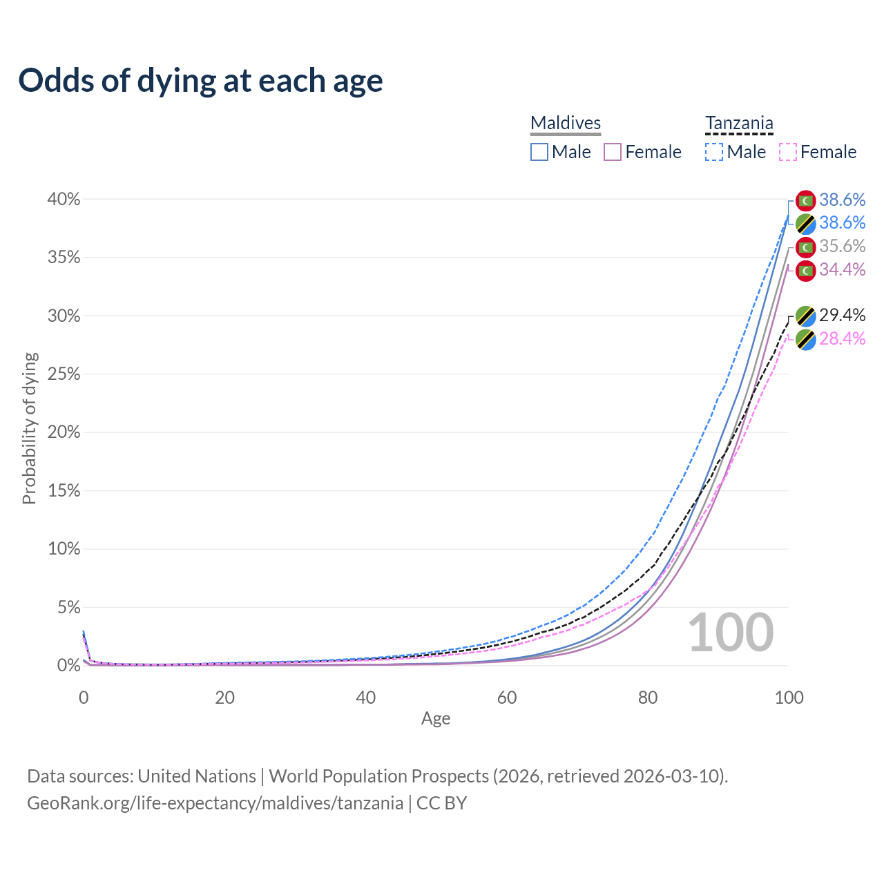 This life expectancy calculator shows the odds of living to 100, 95, 90, and below based on current age for both males and females in Maldives and Tanzania, along with mean and median age of death. The calculations are based on the 2026 life tables (actuarial tables) from the UN World Population Prospects.