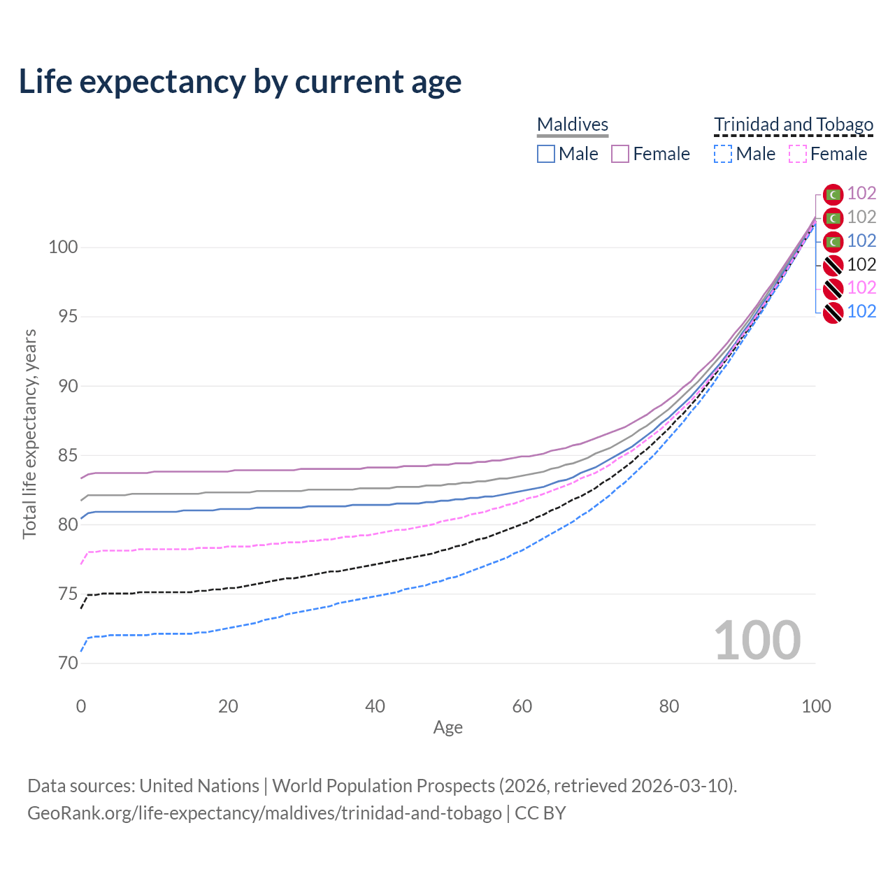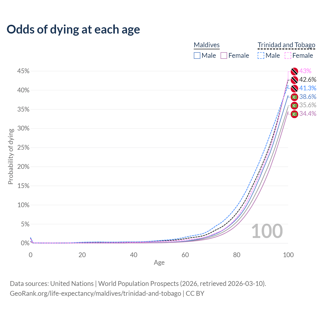This life expectancy calculator shows the odds of living to 100, 95, 90, and below based on current age for both males and females in Maldives and Trinidad and Tobago, along with mean and median age of death. The calculations are based on the 2026 life tables (actuarial tables) from the UN World Population Prospects.