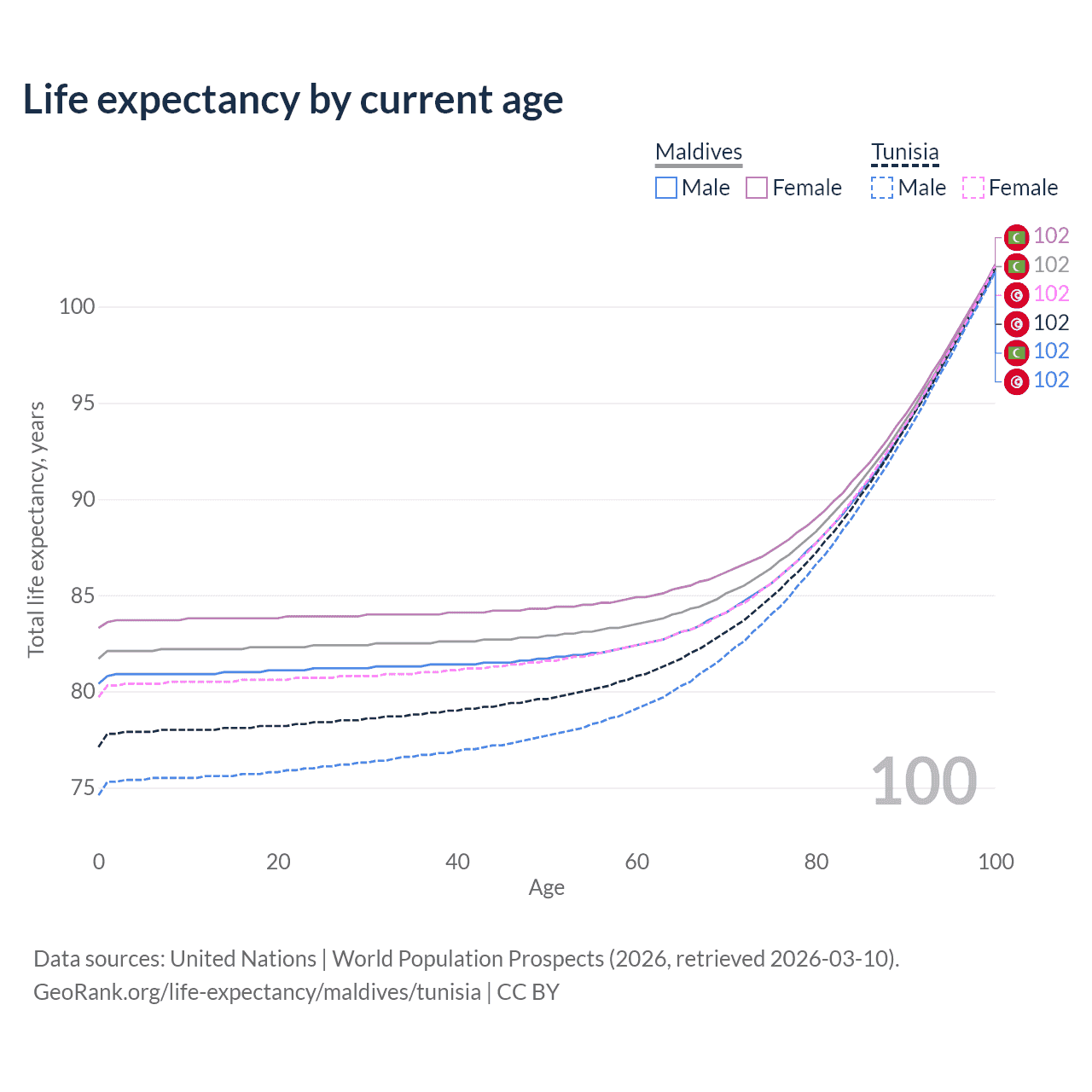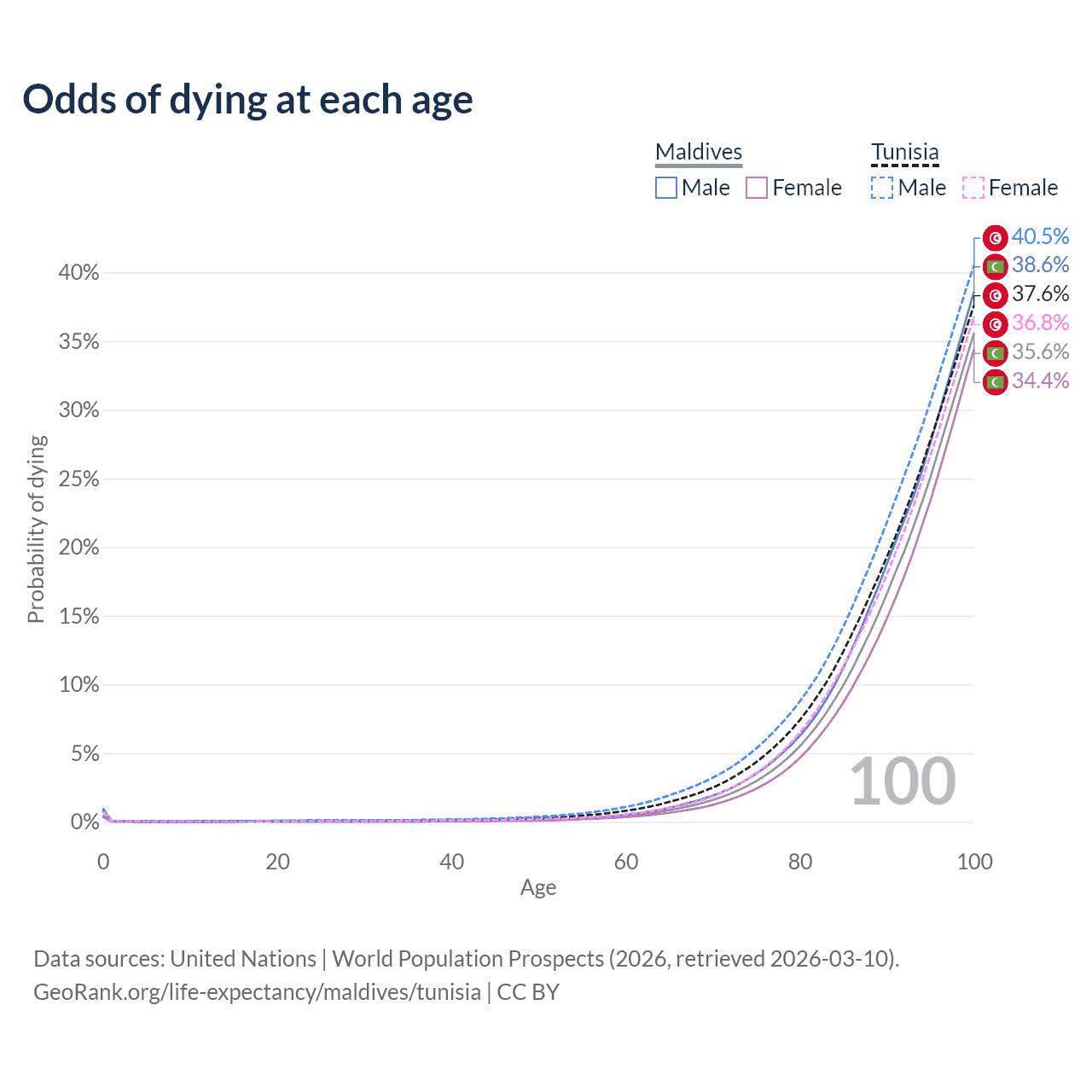 This life expectancy calculator shows the odds of living to 100, 95, 90, and below based on current age for both males and females in Maldives and Tunisia, along with mean and median age of death. The calculations are based on the 2026 life tables (actuarial tables) from the UN World Population Prospects.