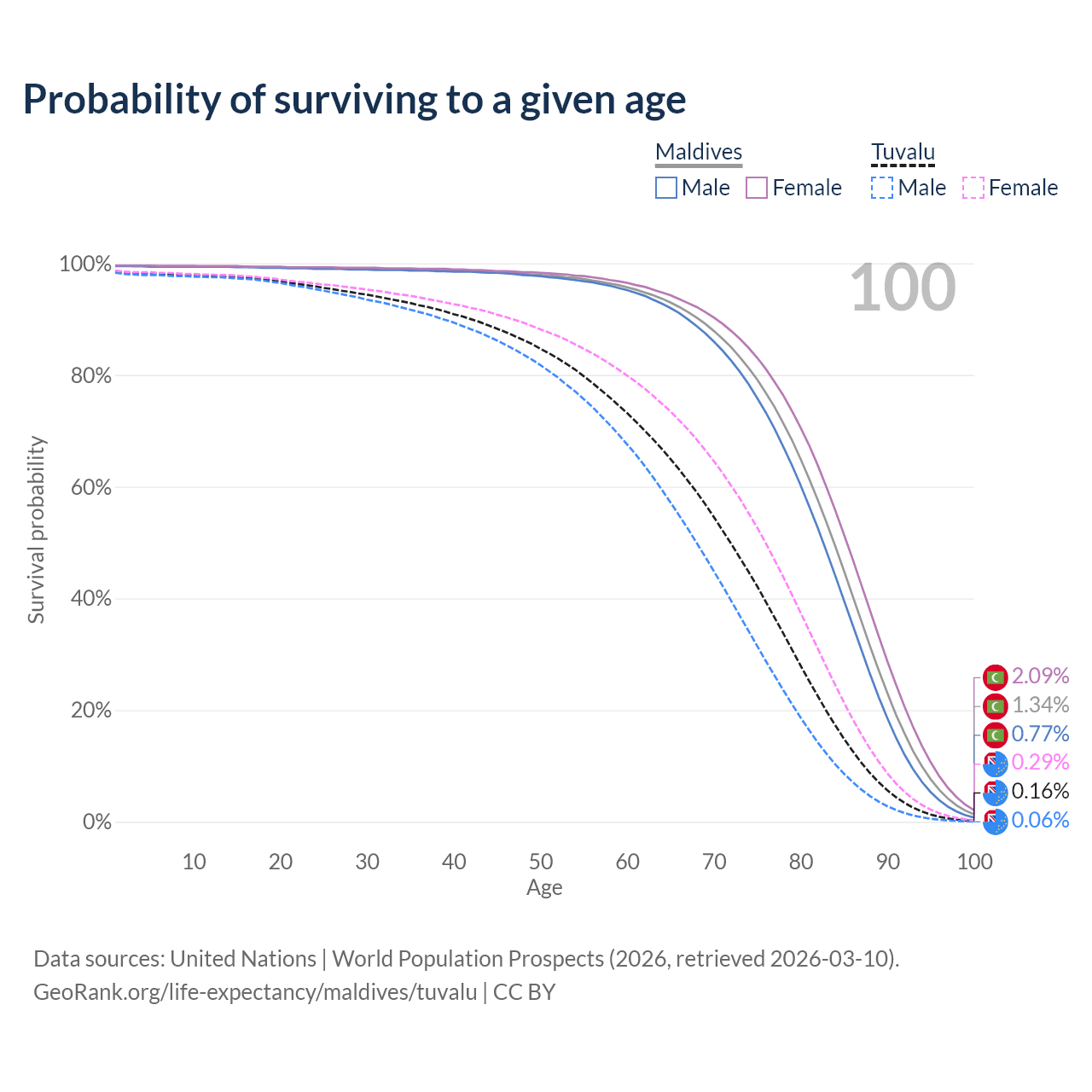 This life expectancy calculator shows the odds of living to 100, 95, 90, and below based on current age for both males and females in Maldives and Tuvalu, along with mean and median age of death. The calculations are based on the 2026 life tables (actuarial tables) from the UN World Population Prospects.