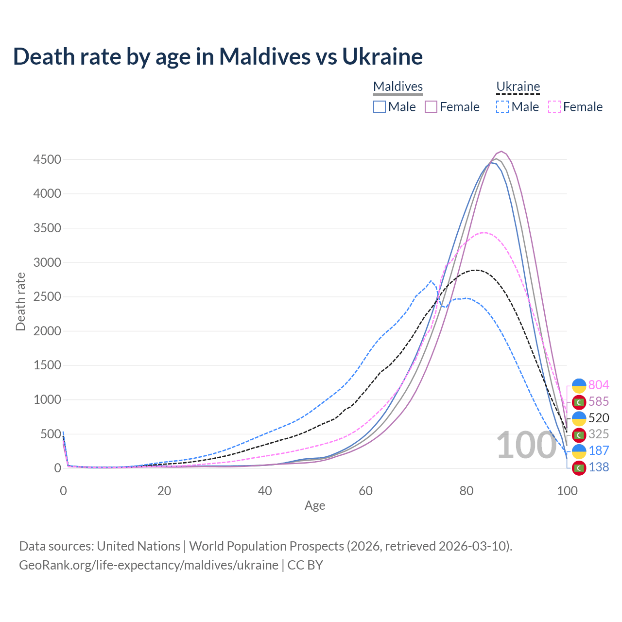 In Maldives, the most common age of death is 86, compared to 82 in Ukraine. The median age of death is 83.8 in Maldives and 78 in Ukraine, meaning only half of each cohort is expected to live past that age.
