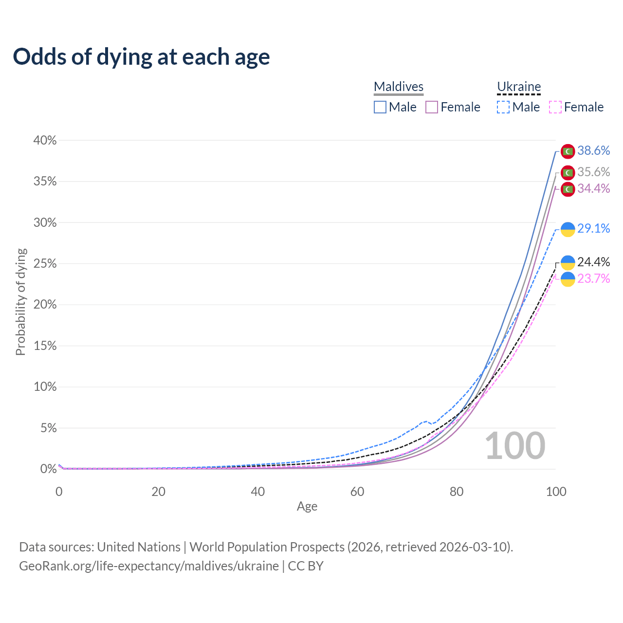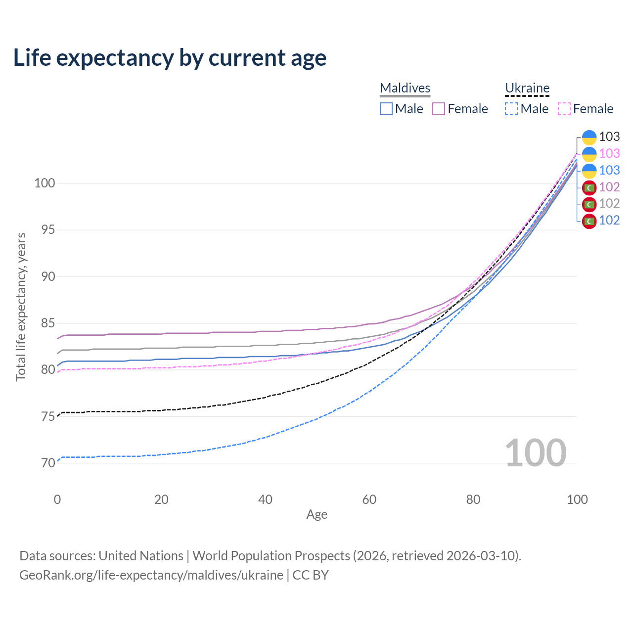 This life expectancy calculator shows the odds of living to 100, 95, 90, and below based on current age for both males and females in Maldives and Ukraine, along with mean and median age of death. The calculations are based on the 2026 life tables (actuarial tables) from the UN World Population Prospects.
