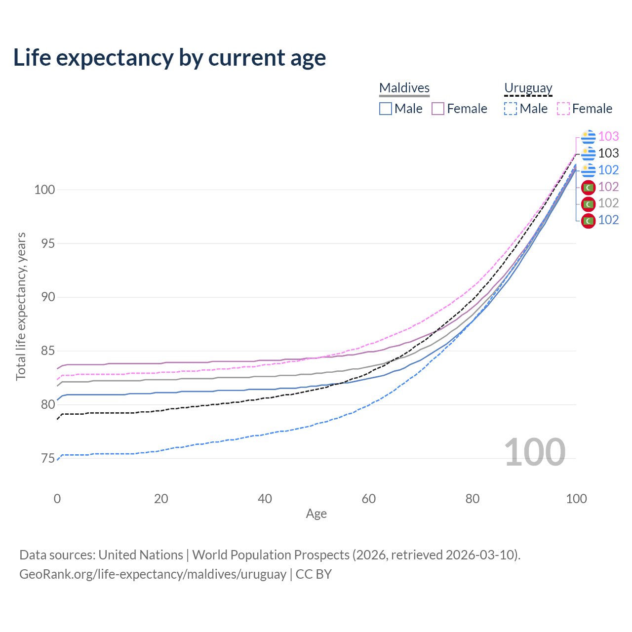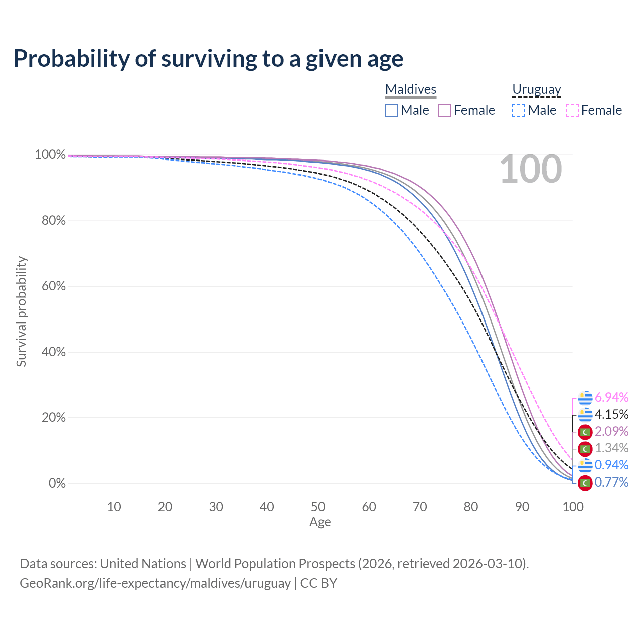 This life expectancy calculator shows the odds of living to 100, 95, 90, and below based on current age for both males and females in Maldives and Uruguay, along with mean and median age of death. The calculations are based on the 2026 life tables (actuarial tables) from the UN World Population Prospects.
