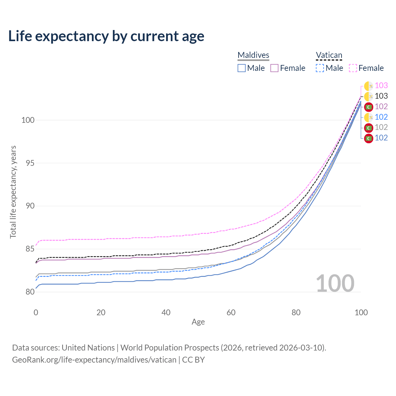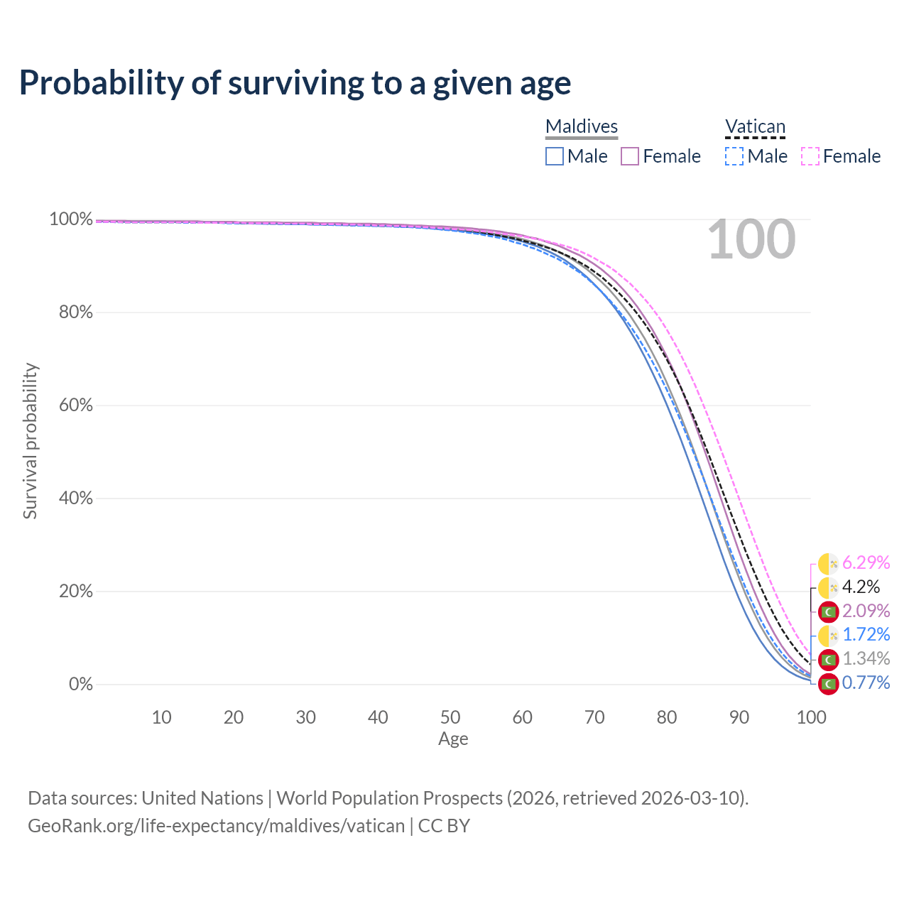 This life expectancy calculator shows the odds of living to 100, 95, 90, and below based on current age for both males and females in Maldives and the Vatican, along with mean and median age of death. The calculations are based on the 2026 life tables (actuarial tables) from the UN World Population Prospects.