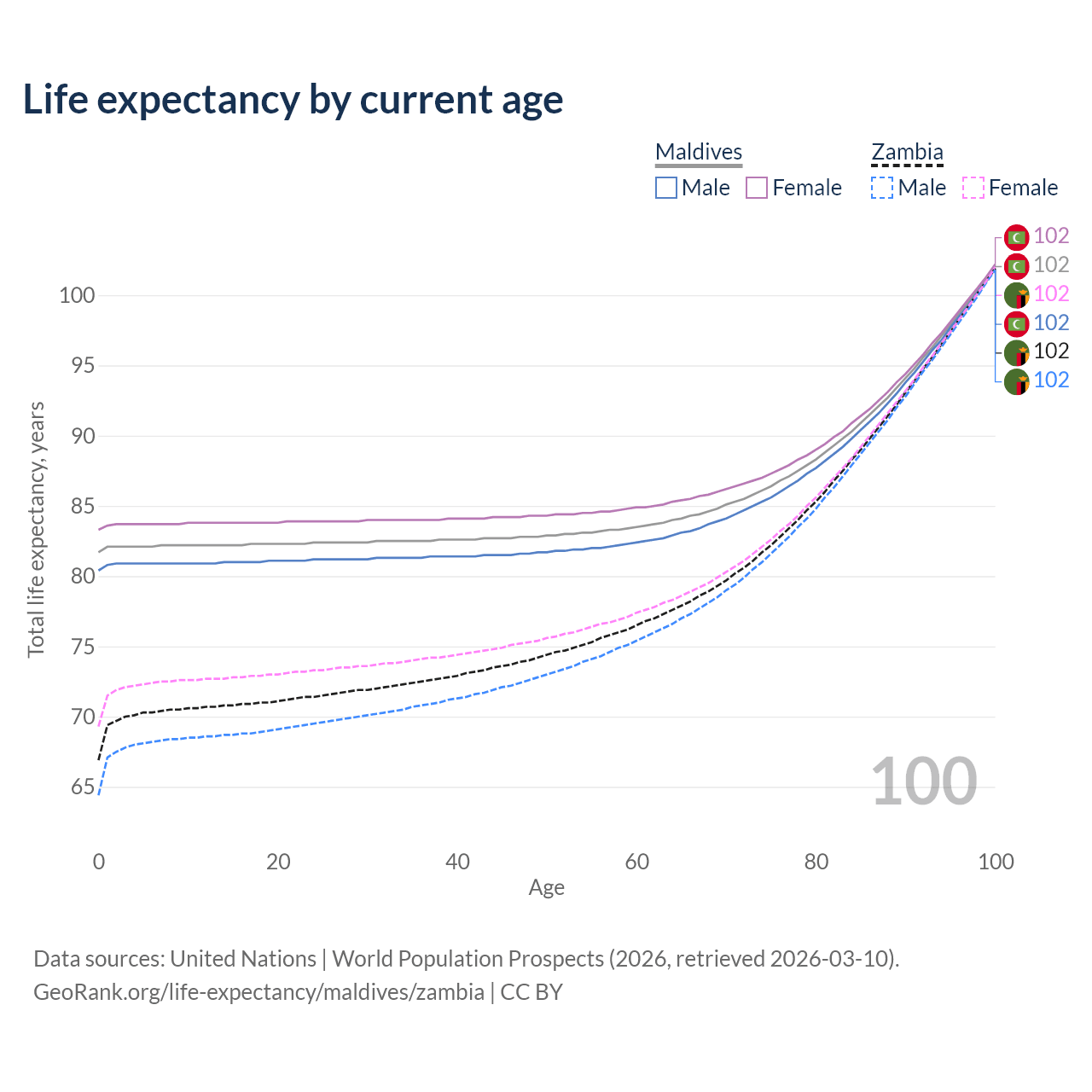 This life expectancy calculator shows the odds of living to 100, 95, 90, and below based on current age for both males and females in Maldives and Zambia, along with mean and median age of death. The calculations are based on the 2026 life tables (actuarial tables) from the UN World Population Prospects.