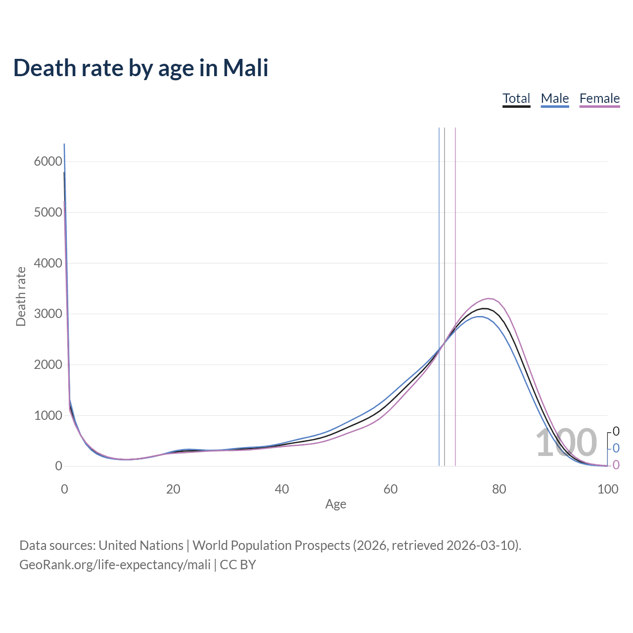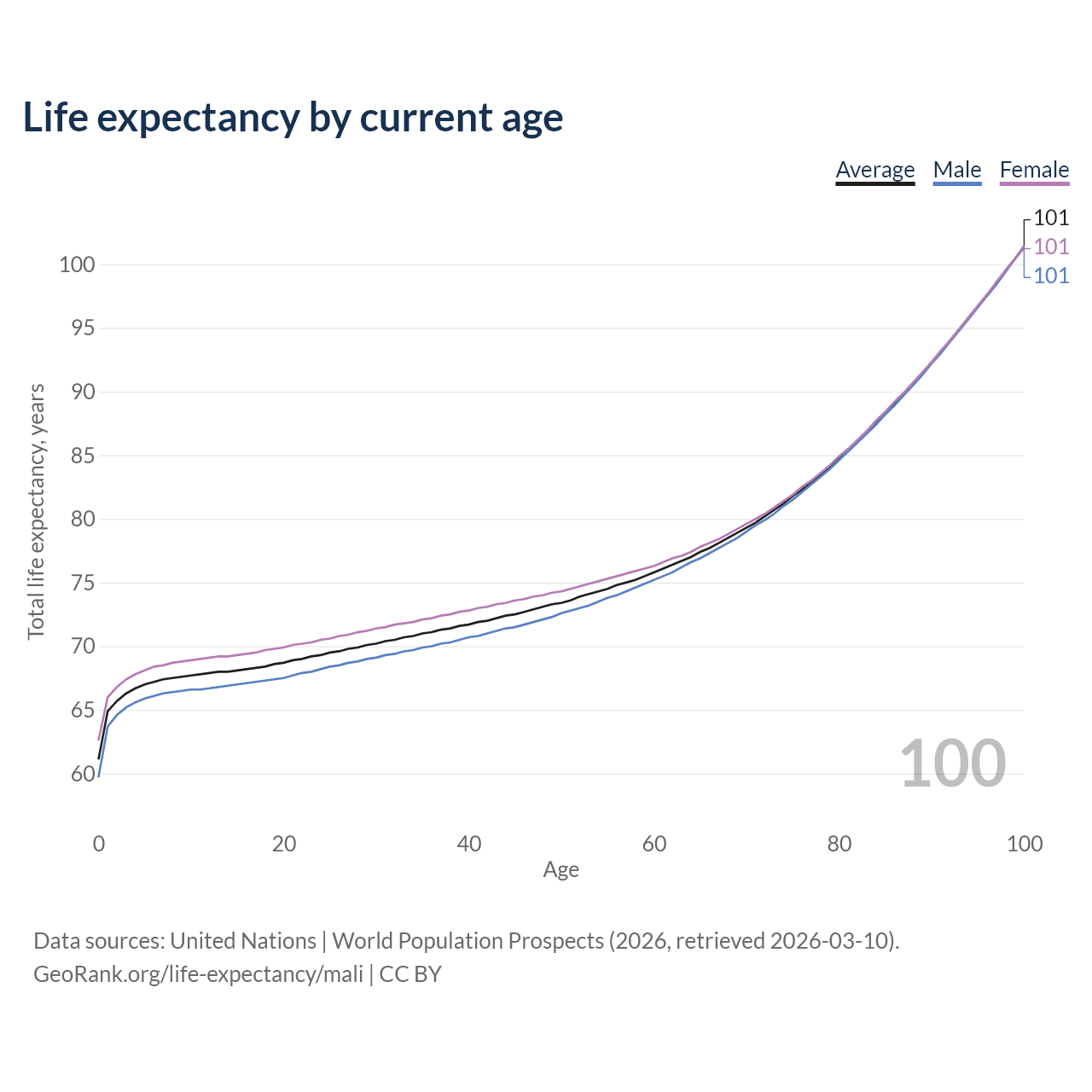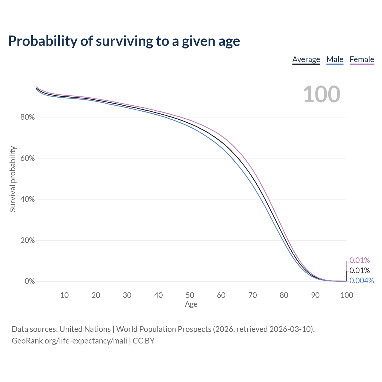 This life expectancy calculator shows the odds of living to 100, 95, 90, and below based on current age for both males and females in Mali, along with mean and median age of death. The calculations are based on the 2026 life tables (actuarial tables) from the UN World Population Prospects.