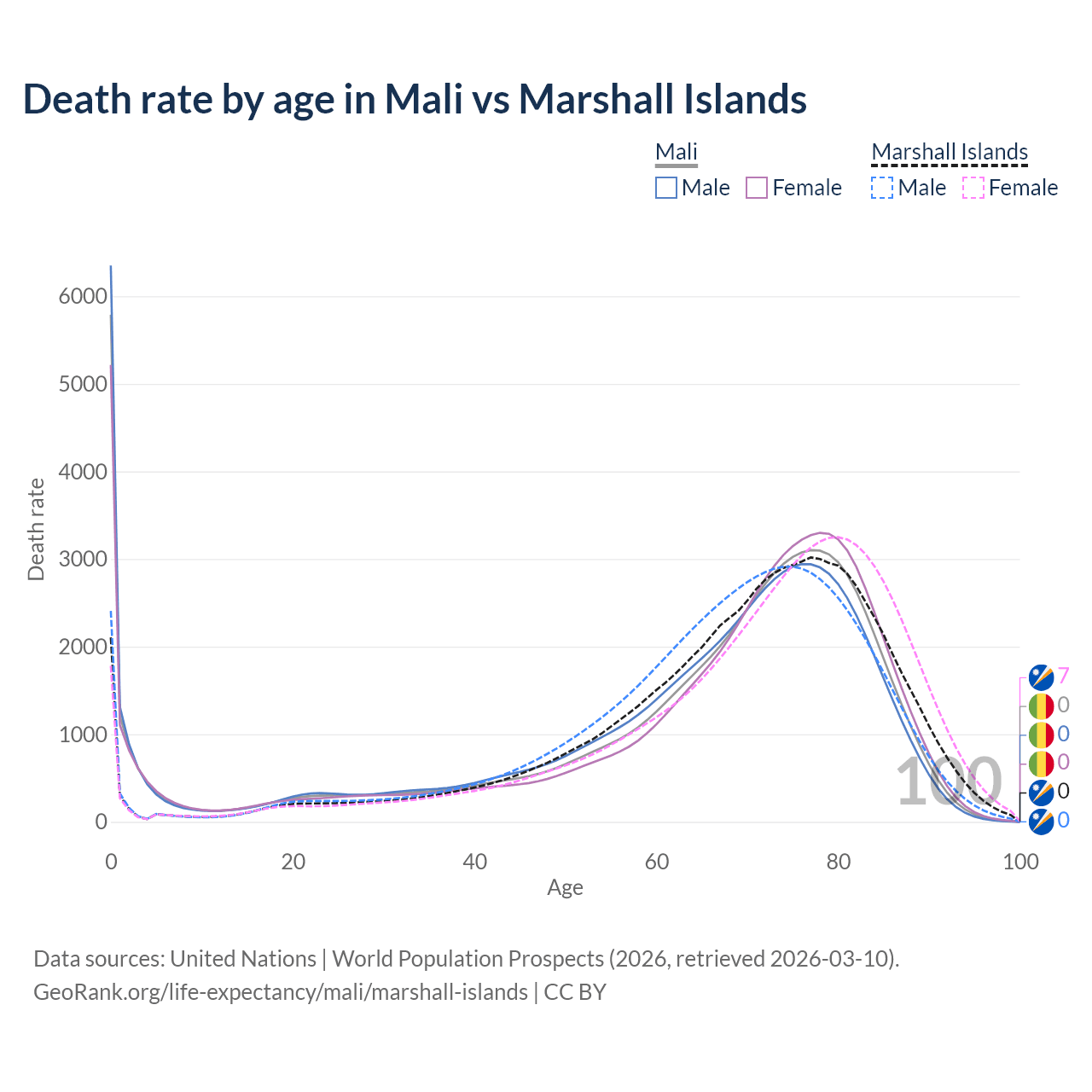 In Mali, the most common age of death is 0, compared to 77 in the Marshall Islands. The median age of death is 70.2 in Mali and 72 in the Marshall Islands, meaning only half of each cohort is expected to live past that age.