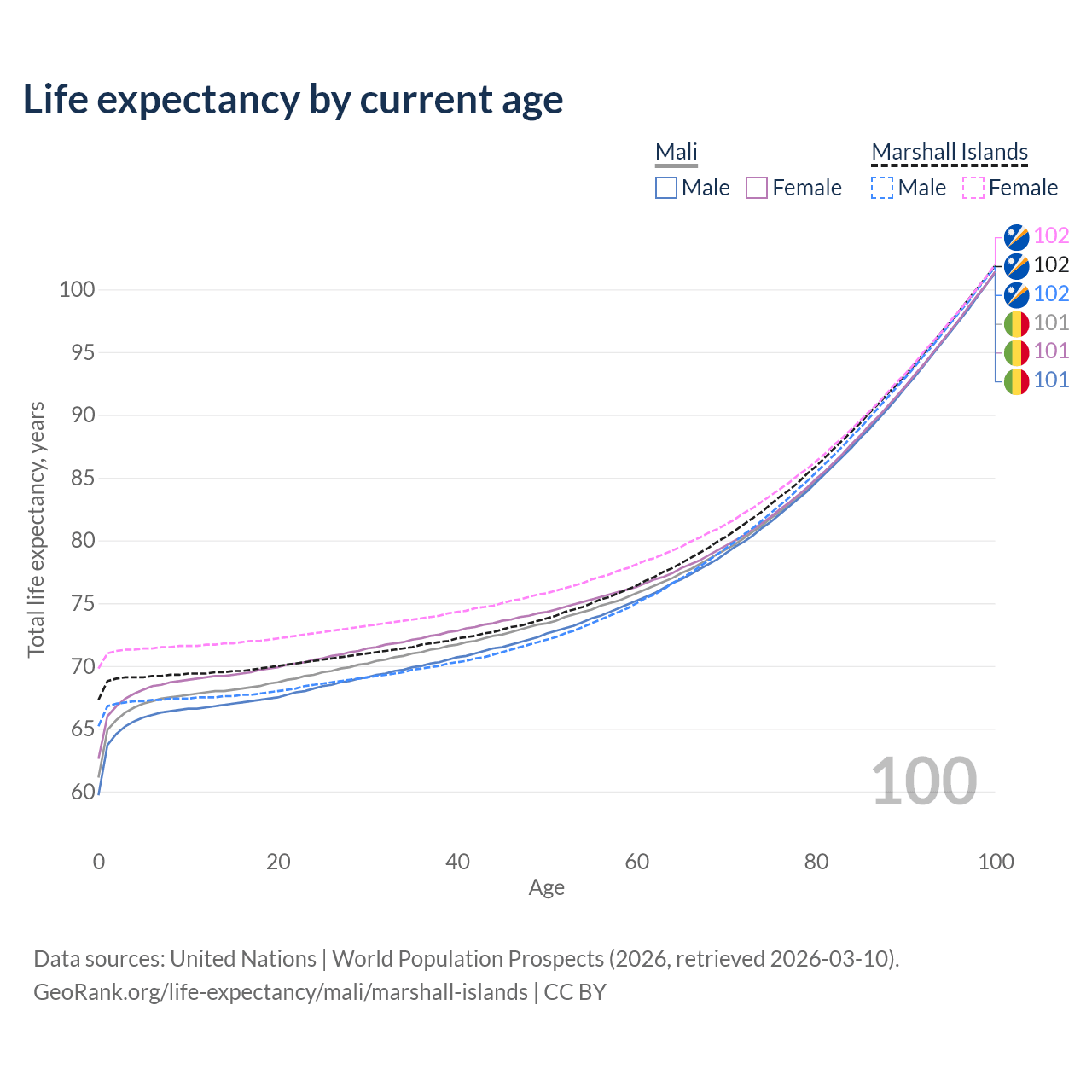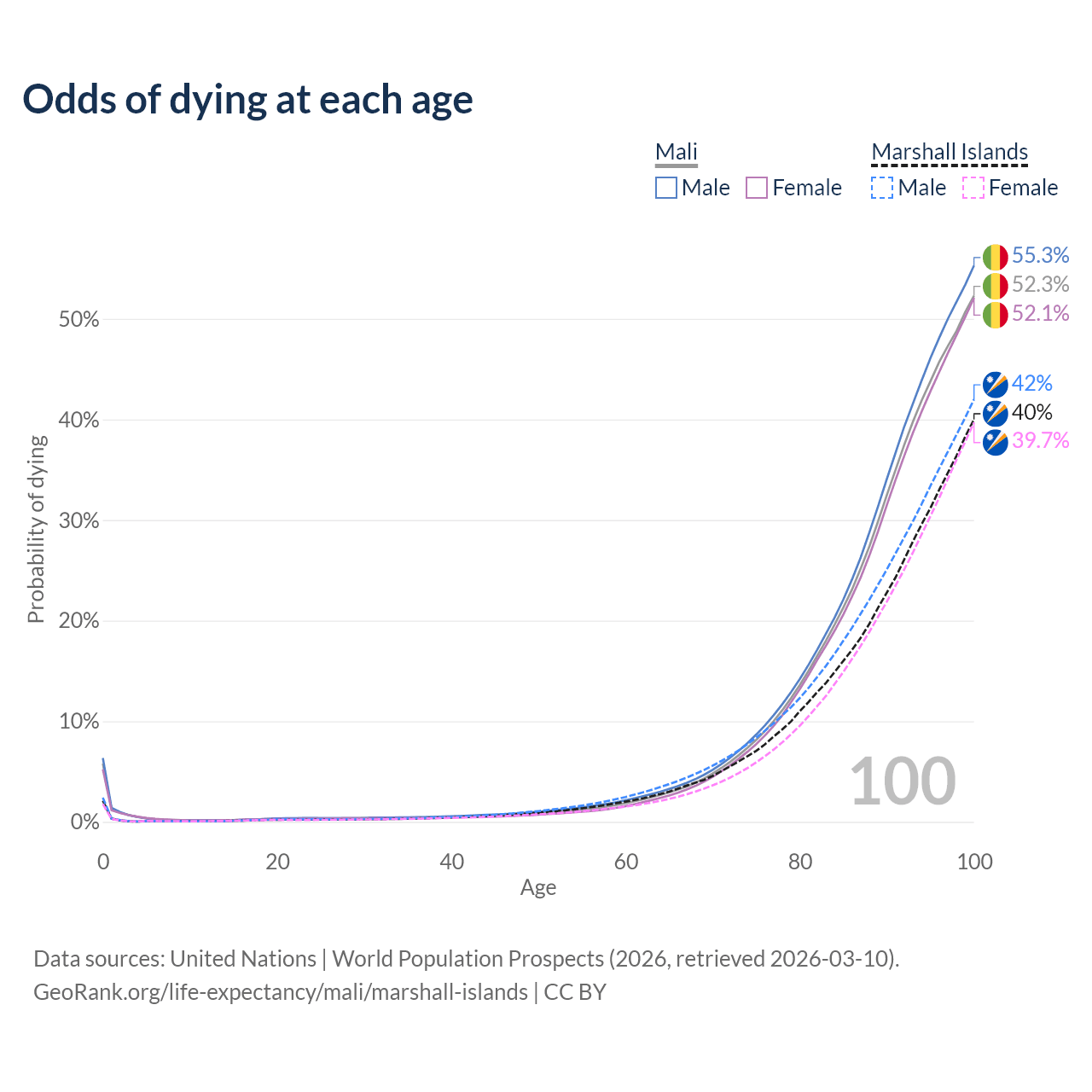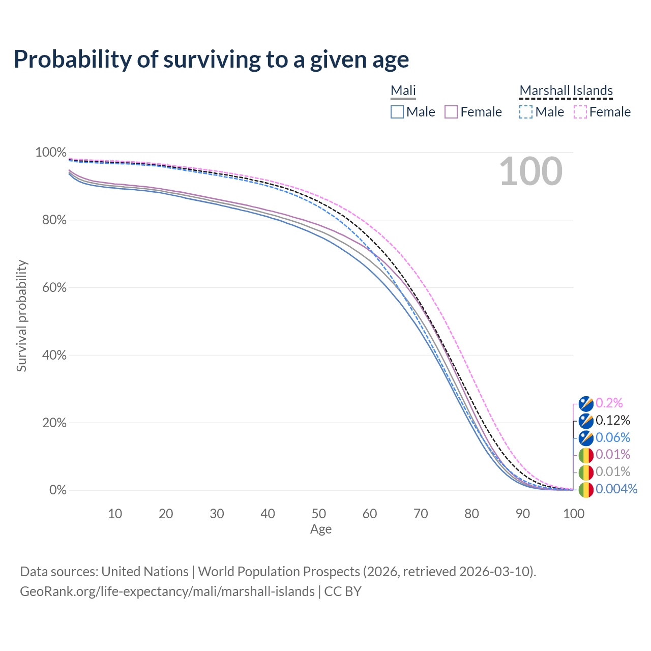 This life expectancy calculator shows the odds of living to 100, 95, 90, and below based on current age for both males and females in Mali and the Marshall Islands, along with mean and median age of death. The calculations are based on the 2026 life tables (actuarial tables) from the UN World Population Prospects.