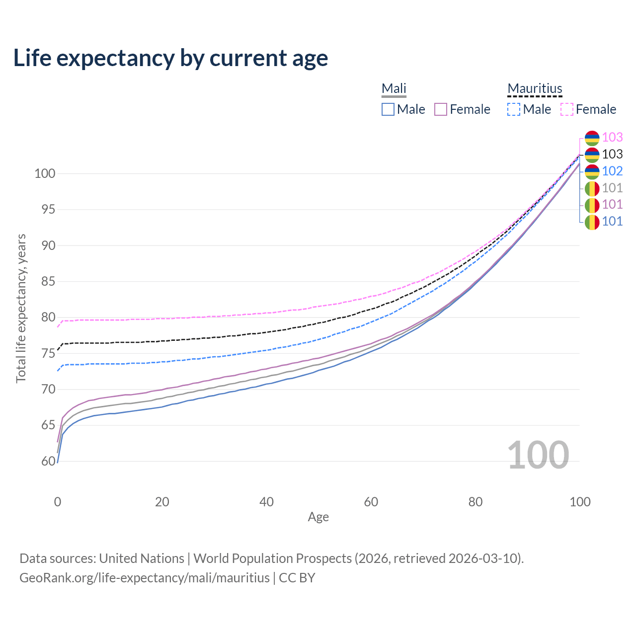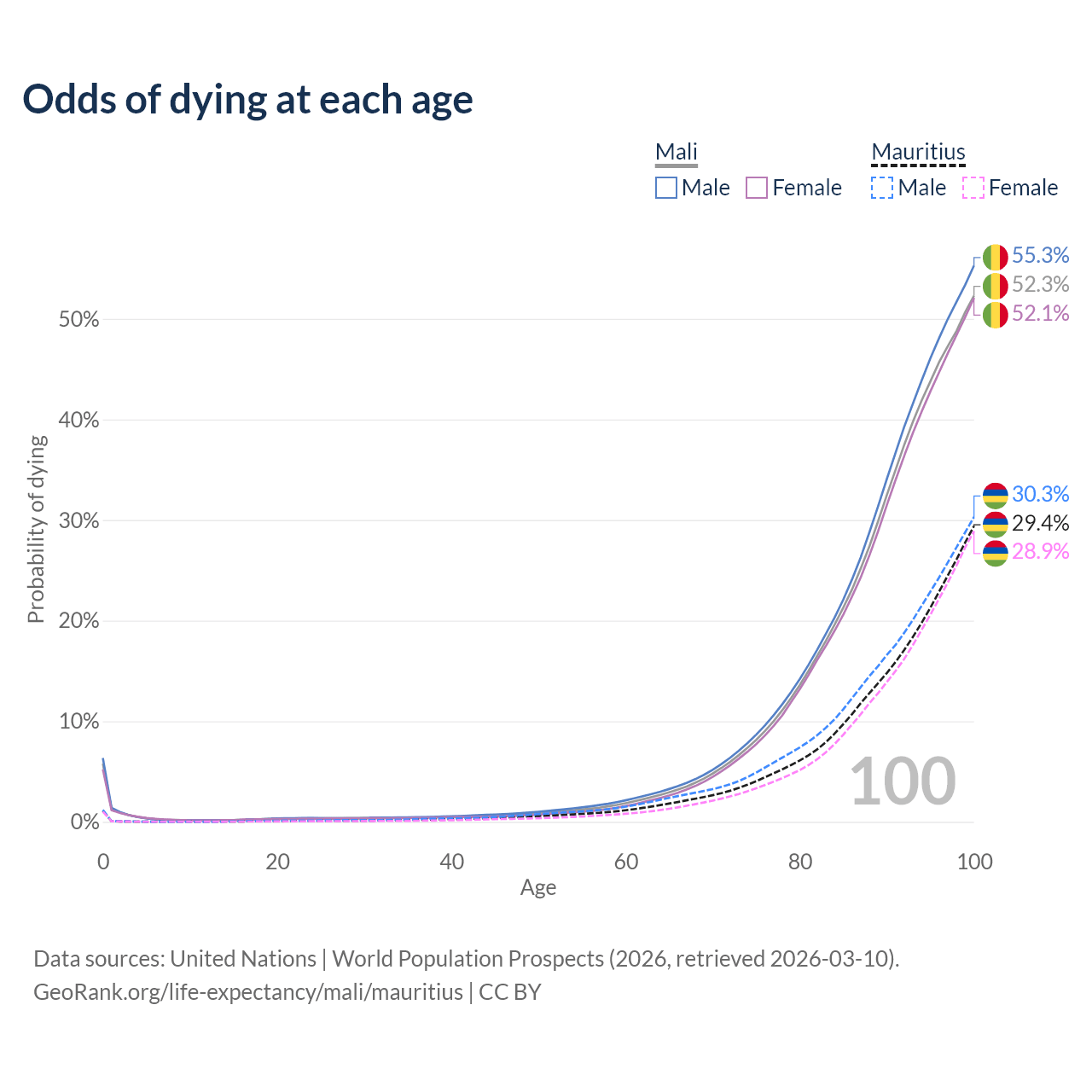 This life expectancy calculator shows the odds of living to 100, 95, 90, and below based on current age for both males and females in Mali and Mauritius, along with mean and median age of death. The calculations are based on the 2026 life tables (actuarial tables) from the UN World Population Prospects.