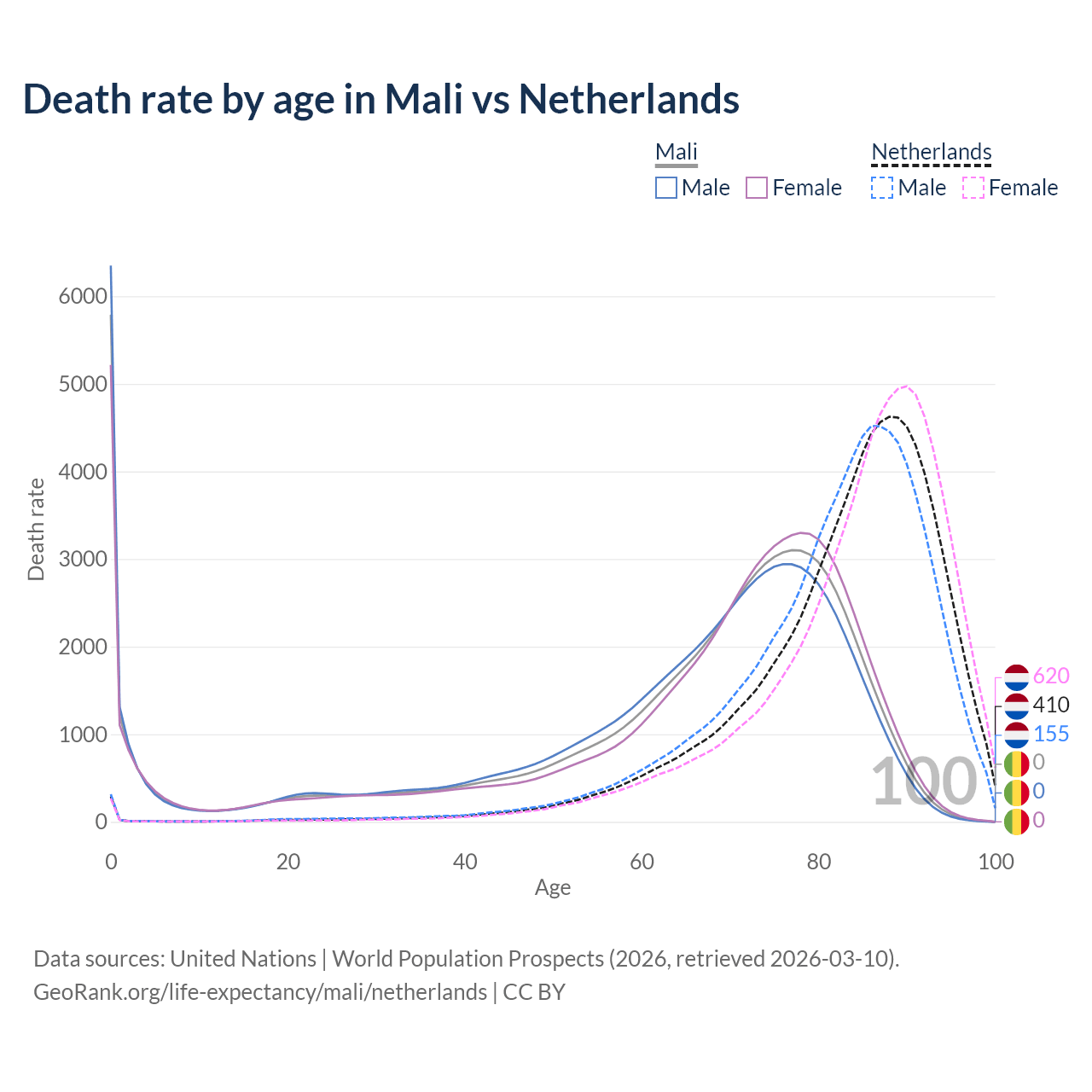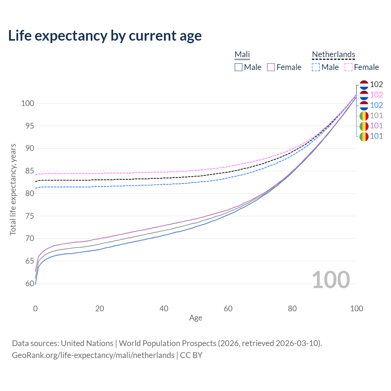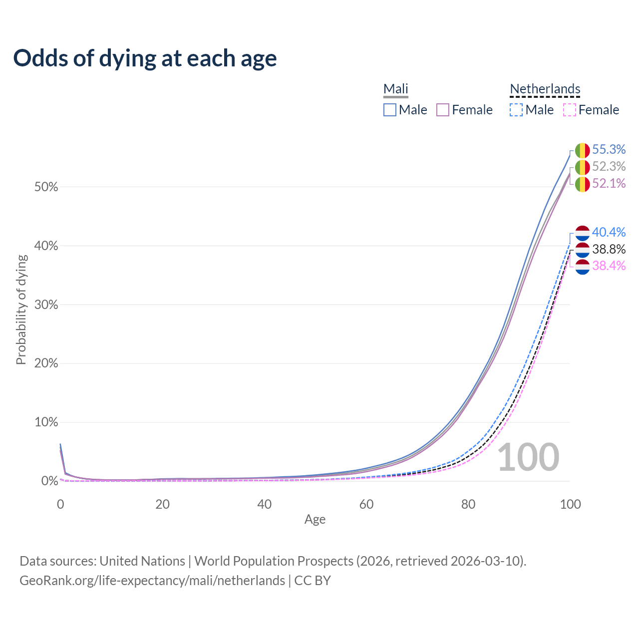 This life expectancy calculator shows the odds of living to 100, 95, 90, and below based on current age for both males and females in Mali and the Netherlands, along with mean and median age of death. The calculations are based on the 2026 life tables (actuarial tables) from the UN World Population Prospects.