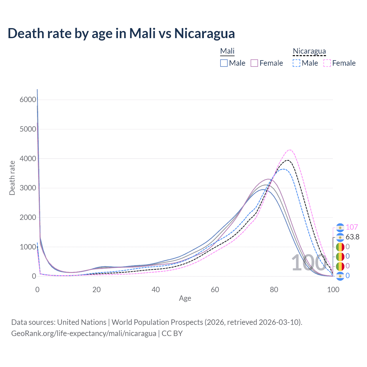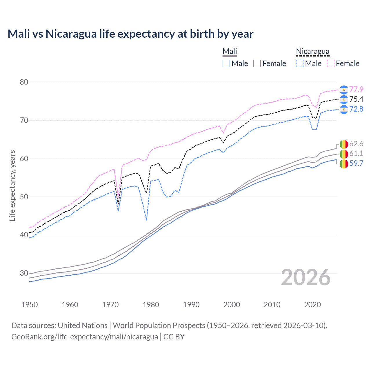 The average life expectancy at birth is 61.1 years in Mali vs 75.4 in Nicaragua. Mali is ranked 191/197 by life expectancy, and Nicaragua is 91/197. In Mali, the life expectancy is 59.7 years for males and 62.6 years for females. In Nicaragua, it's 72.8 years for males and 77.9 years for females.