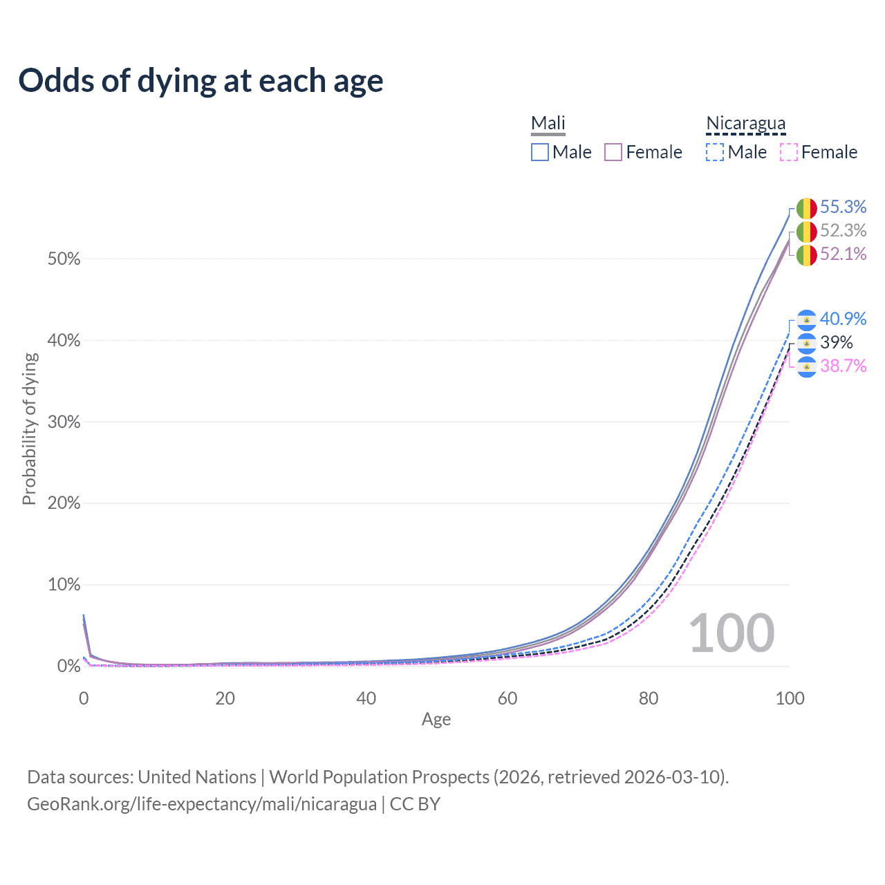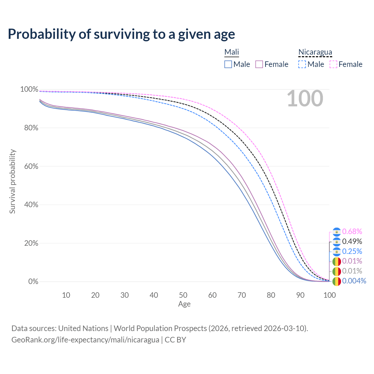 This life expectancy calculator shows the odds of living to 100, 95, 90, and below based on current age for both males and females in Mali and Nicaragua, along with mean and median age of death. The calculations are based on the 2026 life tables (actuarial tables) from the UN World Population Prospects.