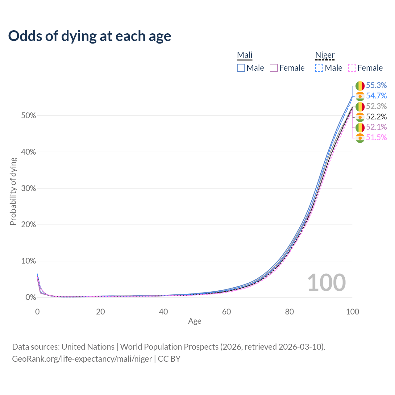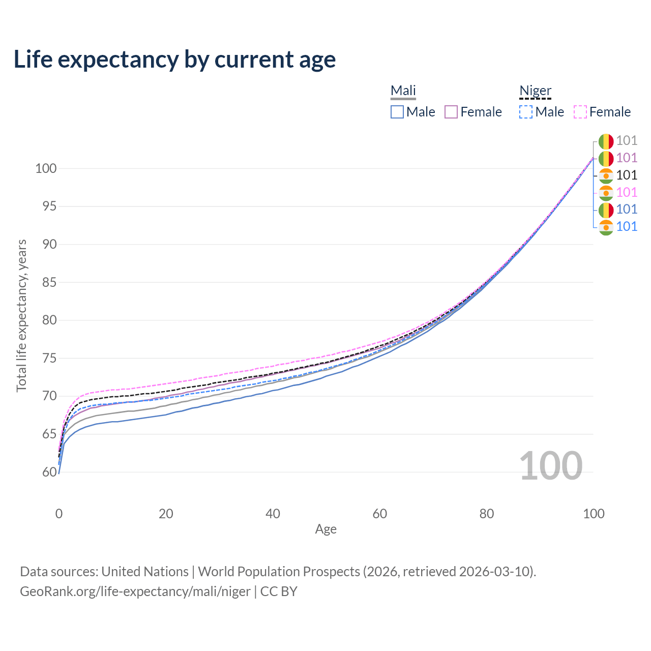 This life expectancy calculator shows the odds of living to 100, 95, 90, and below based on current age for both males and females in Mali and Niger, along with mean and median age of death. The calculations are based on the 2026 life tables (actuarial tables) from the UN World Population Prospects.