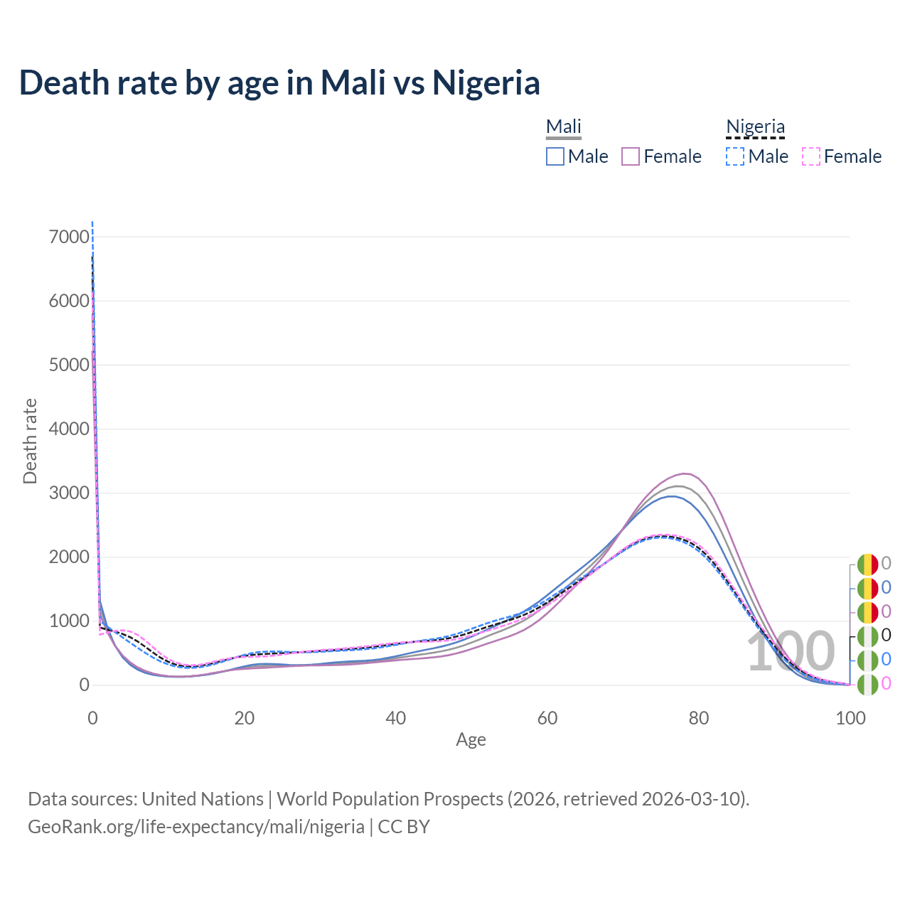 In Mali, the most common age of death is 0, compared to 0 in Nigeria. The median age of death is 70.2 in Mali and 64.3 in Nigeria, meaning only half of each cohort is expected to live past that age.