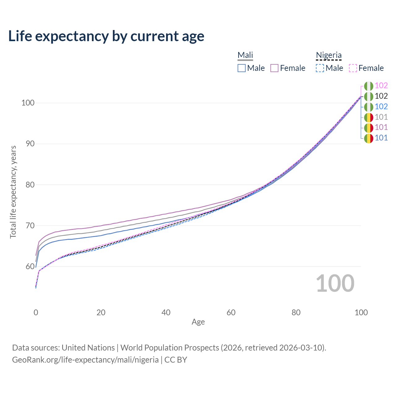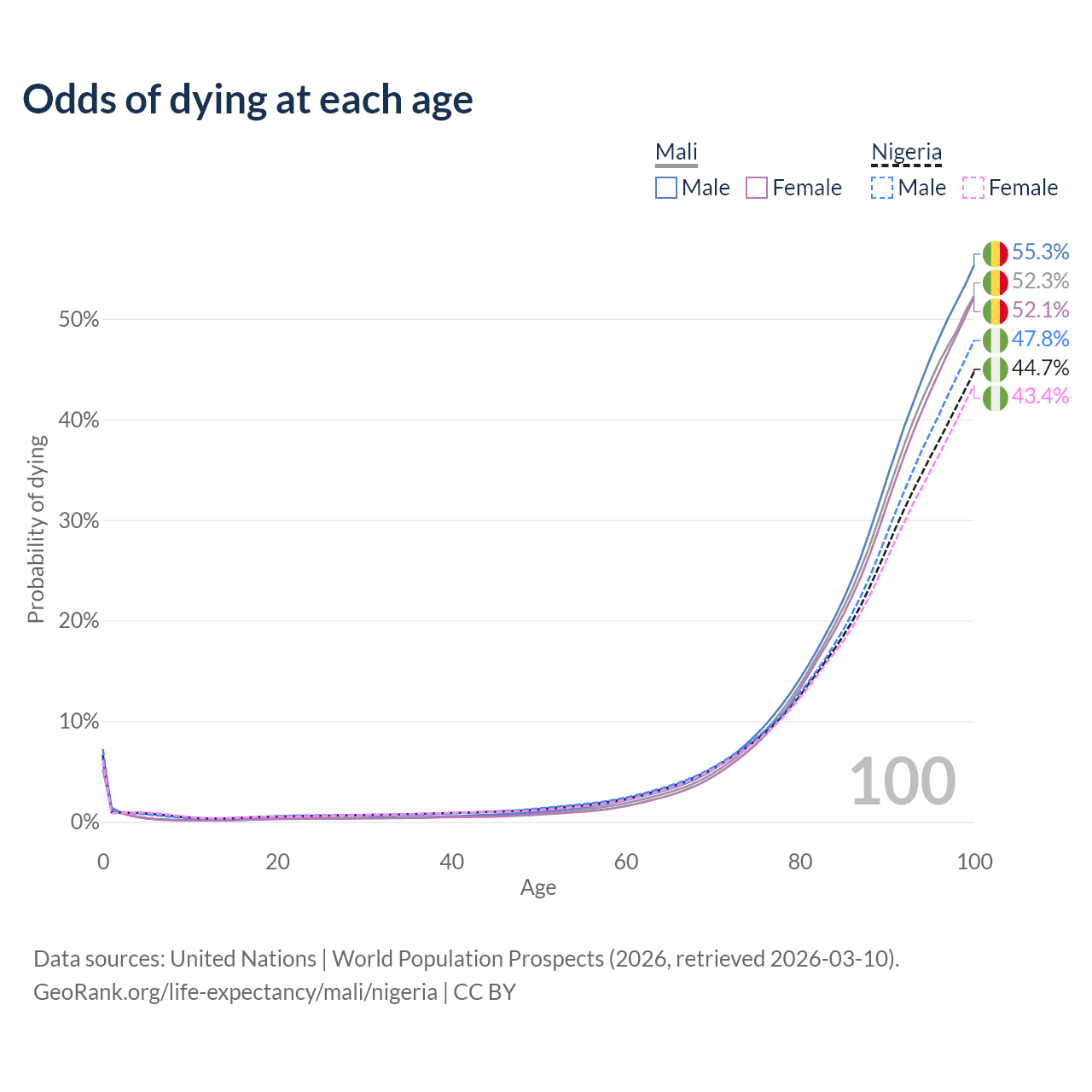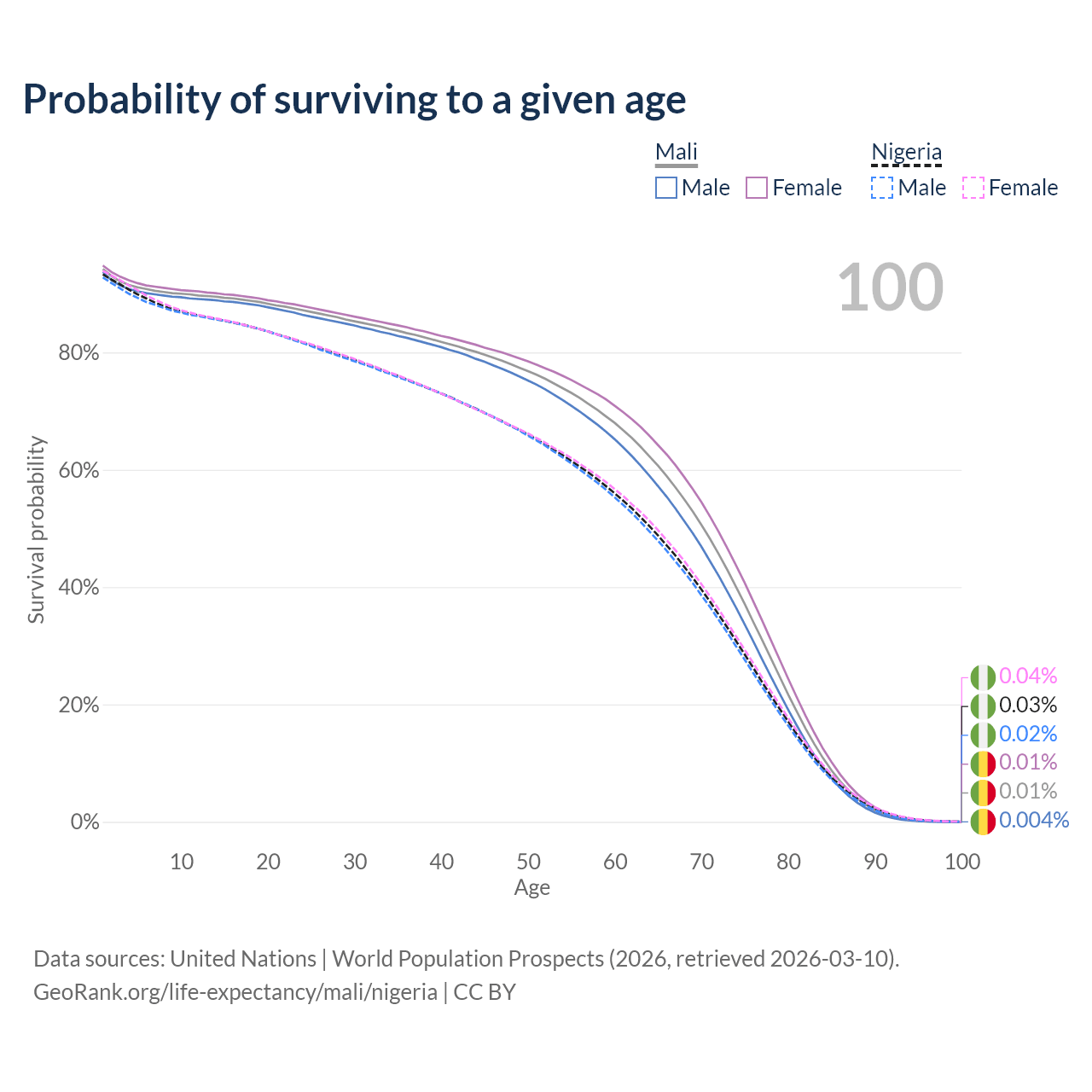 This life expectancy calculator shows the odds of living to 100, 95, 90, and below based on current age for both males and females in Mali and Nigeria, along with mean and median age of death. The calculations are based on the 2026 life tables (actuarial tables) from the UN World Population Prospects.