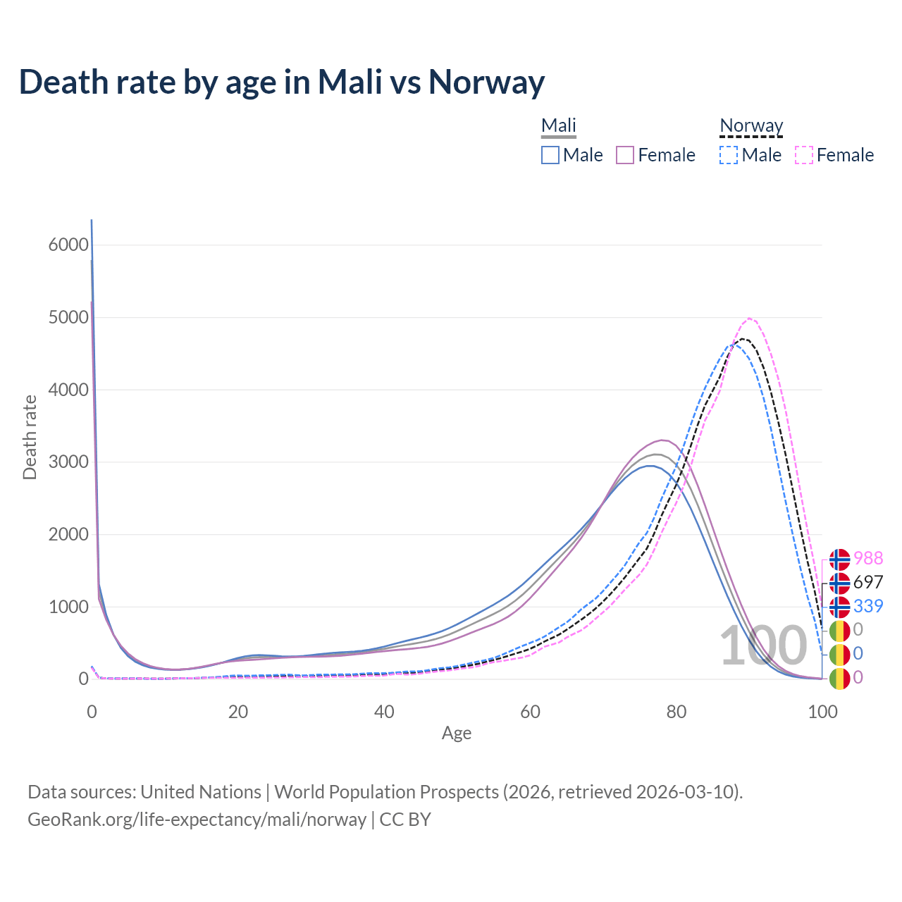 In Mali, the most common age of death is 0, compared to 89 in Norway. The median age of death is 70.2 in Mali and 86.5 in Norway, meaning only half of each cohort is expected to live past that age.
