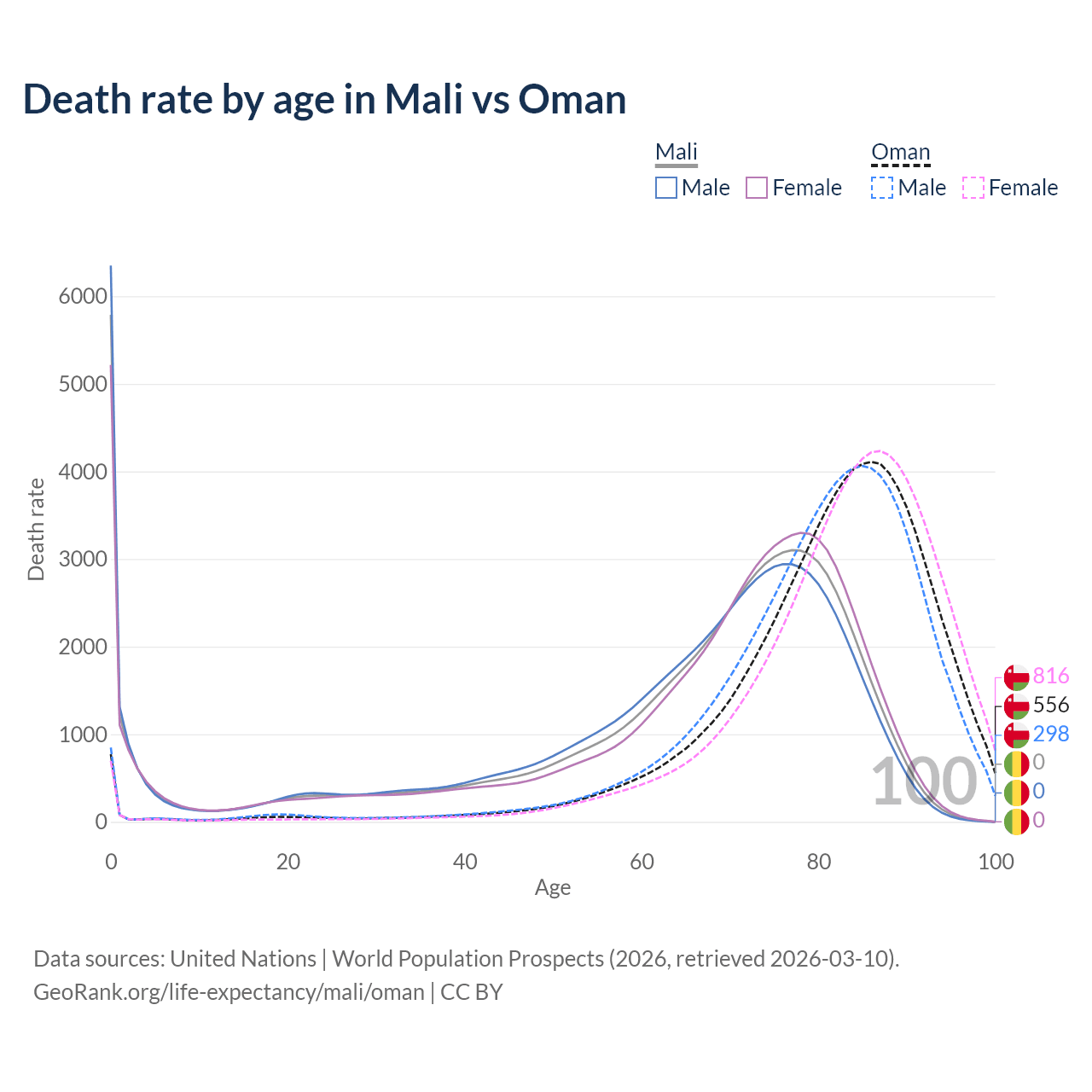 In Mali, the most common age of death is 0, compared to 86 in Oman. The median age of death is 70.2 in Mali and 83.5 in Oman, meaning only half of each cohort is expected to live past that age.
