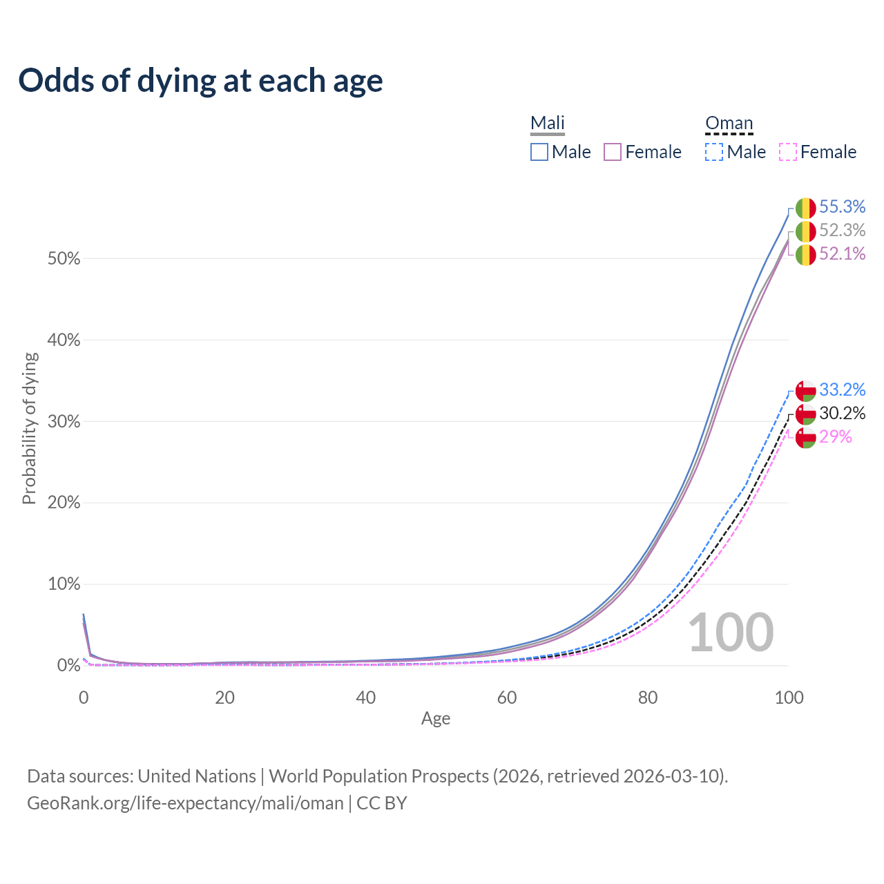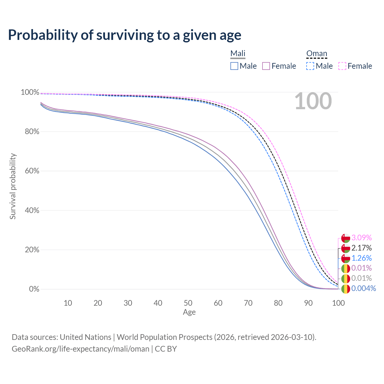 This life expectancy calculator shows the odds of living to 100, 95, 90, and below based on current age for both males and females in Mali and Oman, along with mean and median age of death. The calculations are based on the 2026 life tables (actuarial tables) from the UN World Population Prospects.