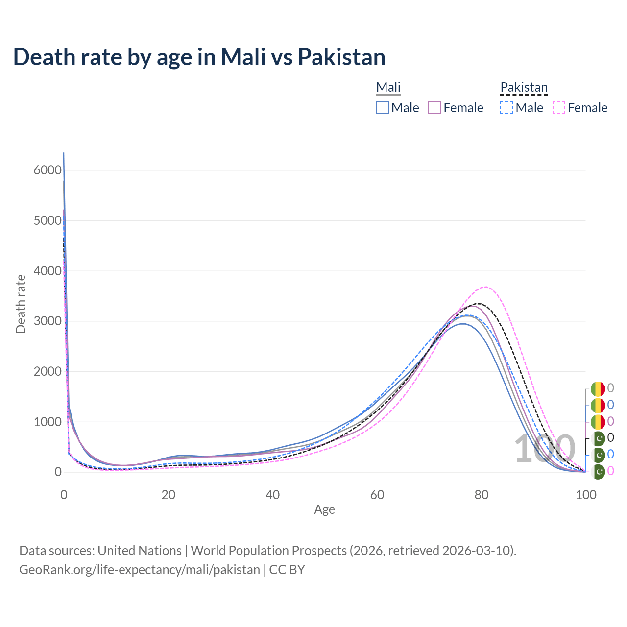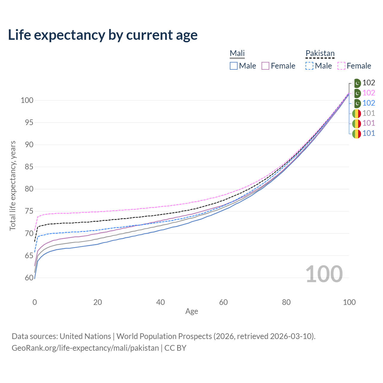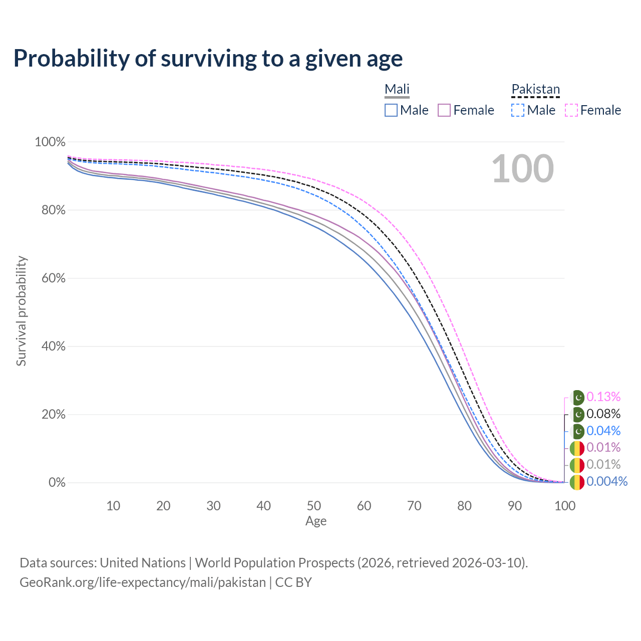 This life expectancy calculator shows the odds of living to 100, 95, 90, and below based on current age for both males and females in Mali and Pakistan, along with mean and median age of death. The calculations are based on the 2026 life tables (actuarial tables) from the UN World Population Prospects.