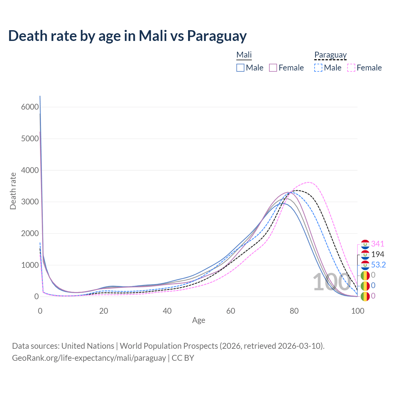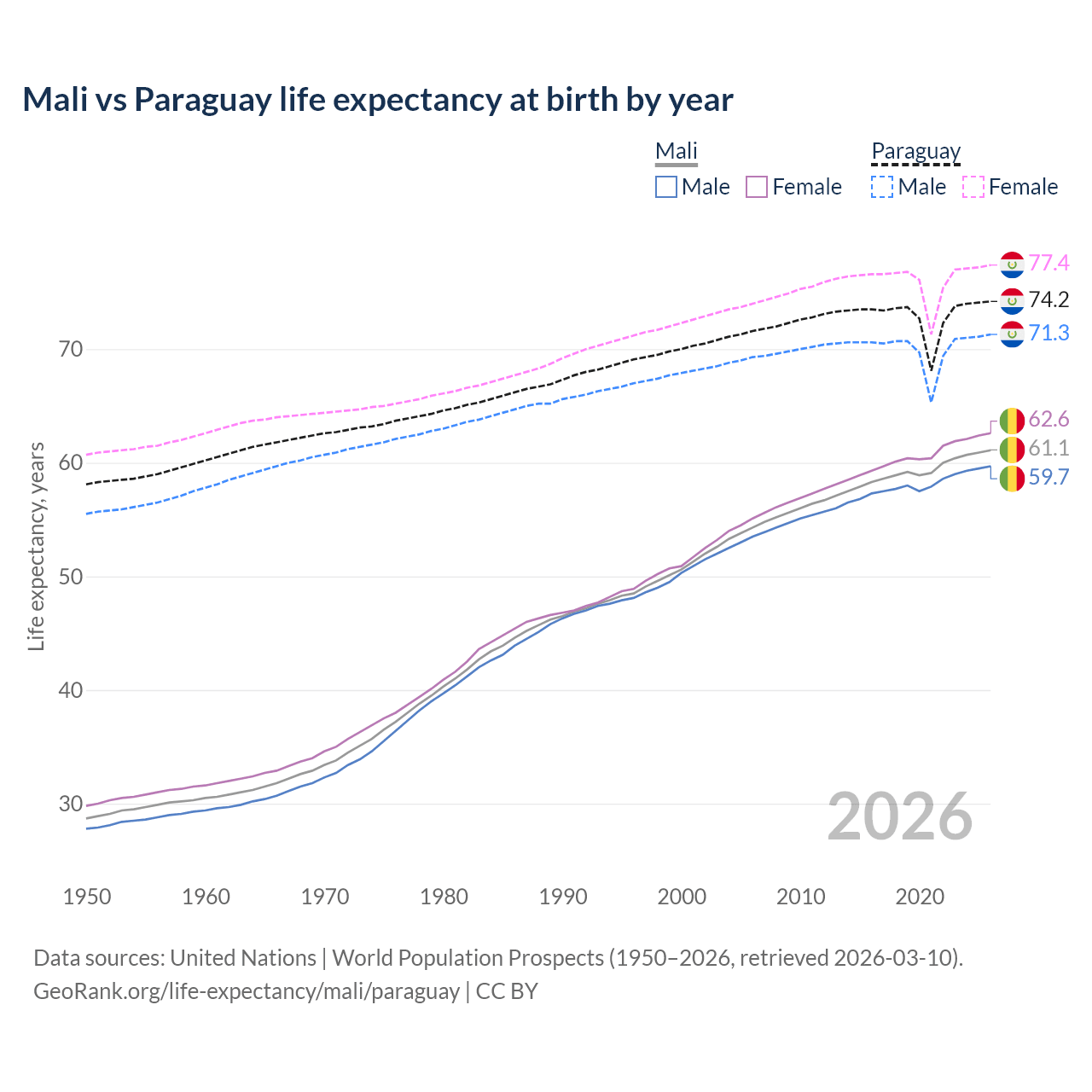The average life expectancy at birth is 61.1 years in Mali vs 74.2 in Paraguay. Mali is ranked 191/197 by life expectancy, and Paraguay is 100/197. In Mali, the life expectancy is 59.7 years for males and 62.6 years for females. In Paraguay, it's 71.3 years for males and 77.4 years for females.