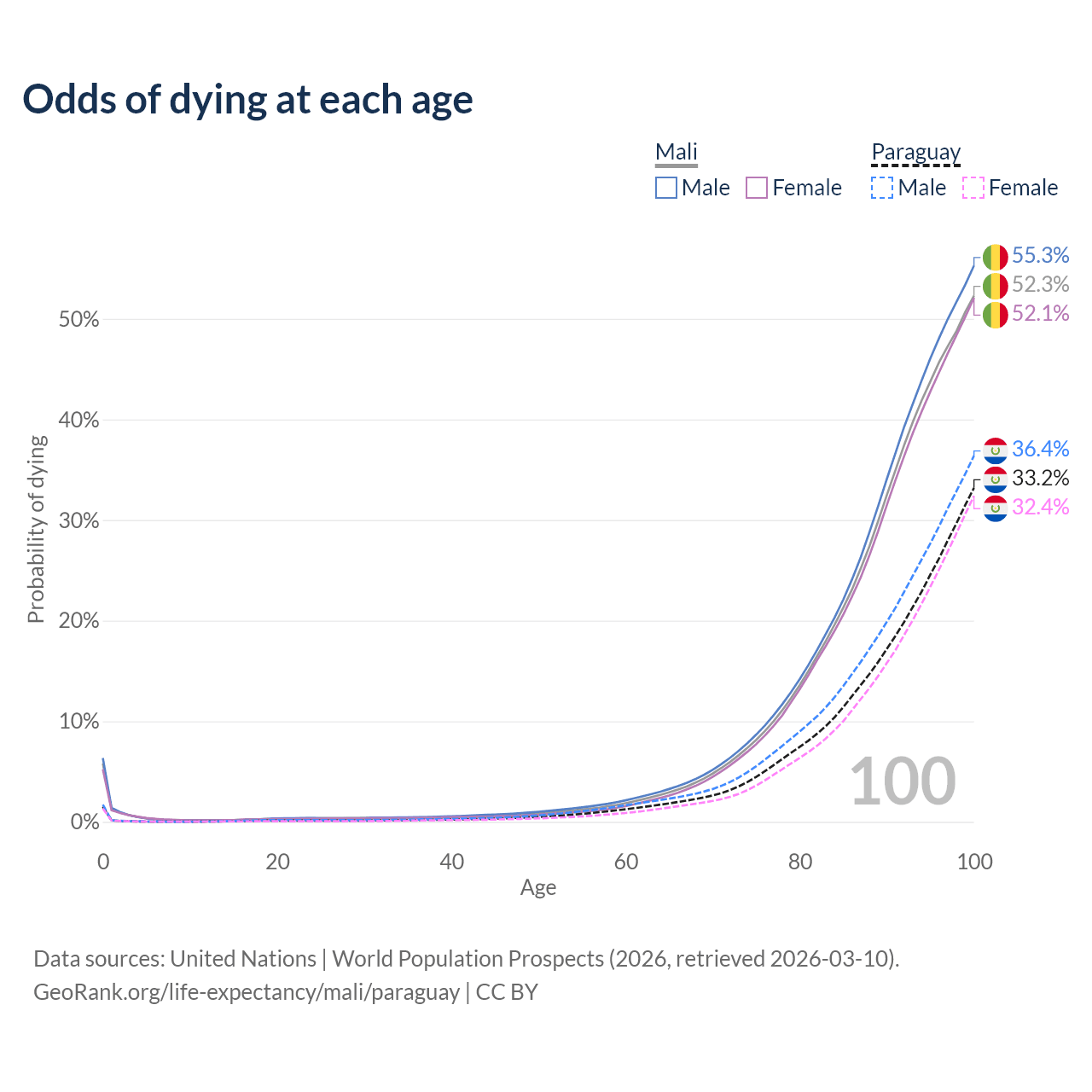 This life expectancy calculator shows the odds of living to 100, 95, 90, and below based on current age for both males and females in Mali and Paraguay, along with mean and median age of death. The calculations are based on the 2026 life tables (actuarial tables) from the UN World Population Prospects.