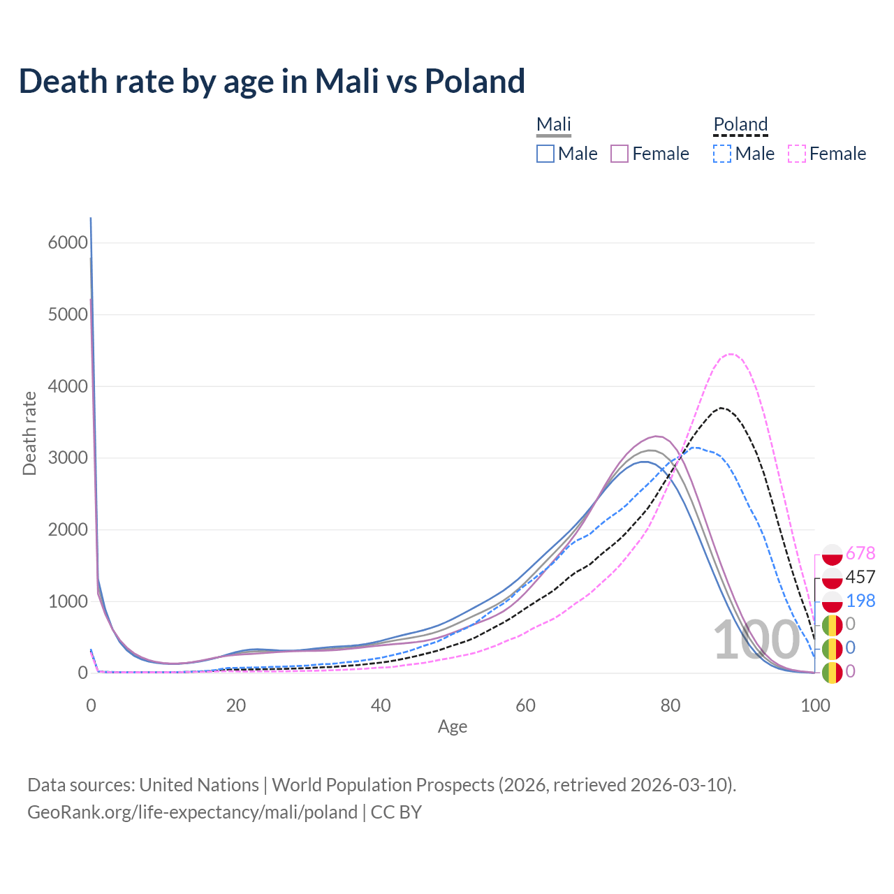 Note that this chart does not show rates per 100,000 population, as those would be skewed by age structure differences and reflect the demographics of Mali and Poland more than their death rates.