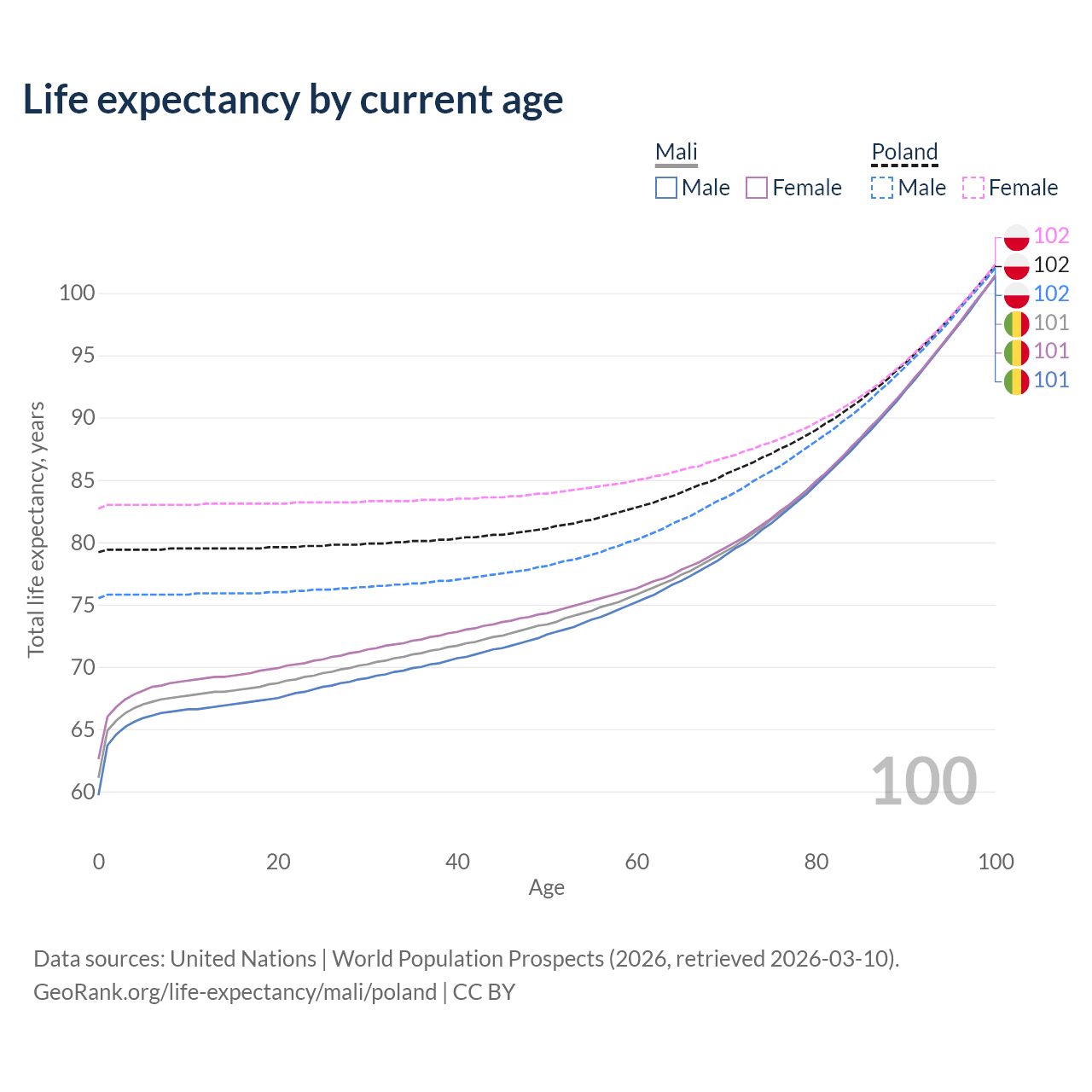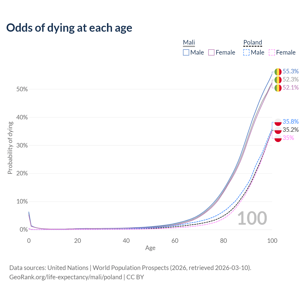 This life expectancy calculator shows the odds of living to 100, 95, 90, and below based on current age for both males and females in Mali and Poland, along with mean and median age of death. The calculations are based on the 2026 life tables (actuarial tables) from the UN World Population Prospects.
