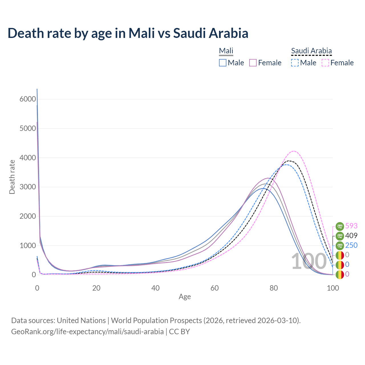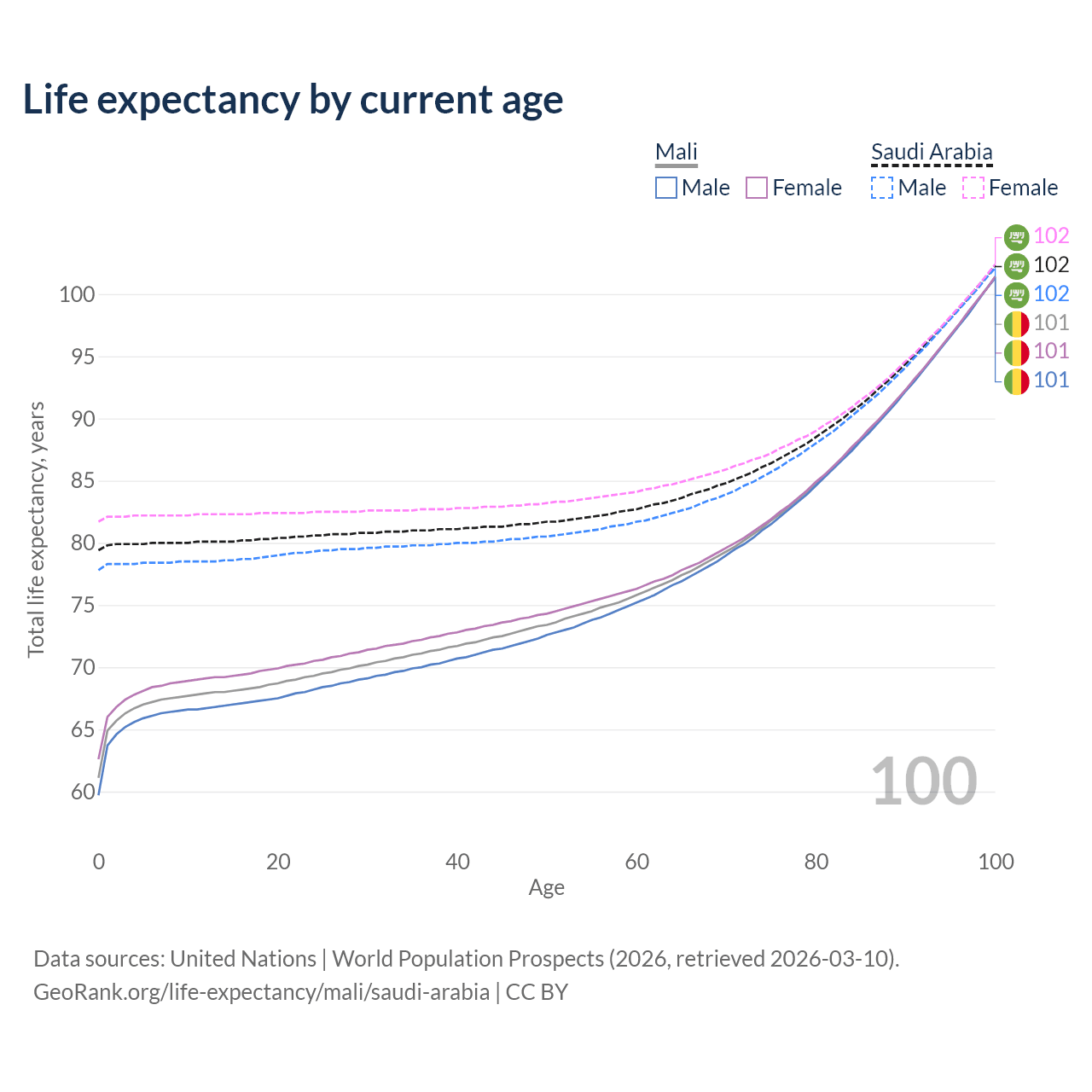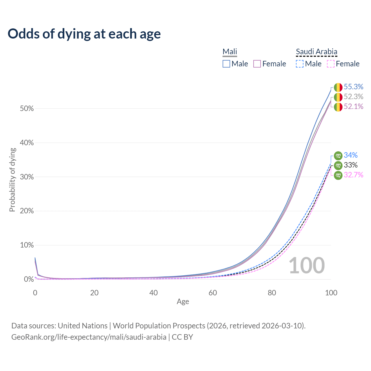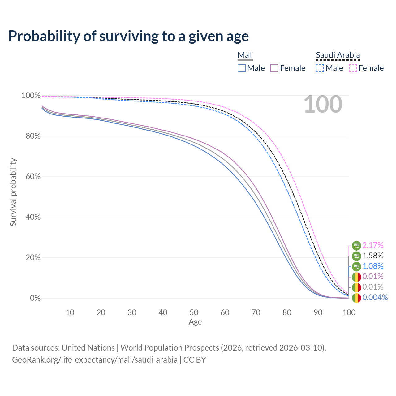This life expectancy calculator shows the odds of living to 100, 95, 90, and below based on current age for both males and females in Mali and Saudi Arabia, along with mean and median age of death. The calculations are based on the 2026 life tables (actuarial tables) from the UN World Population Prospects.