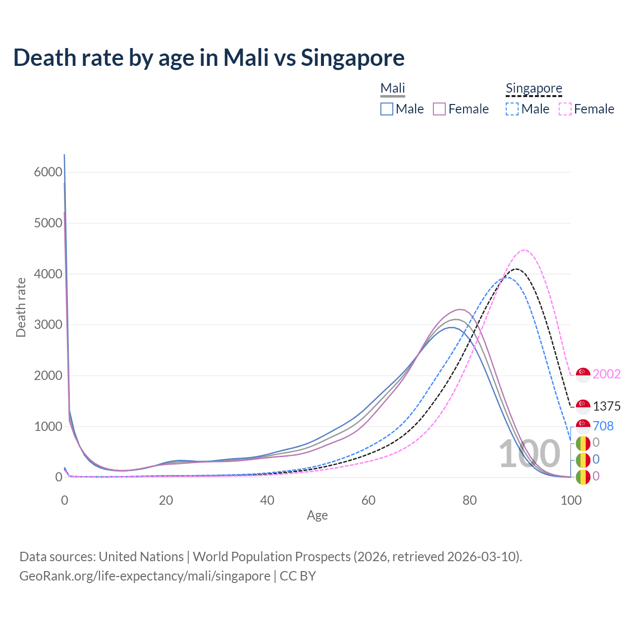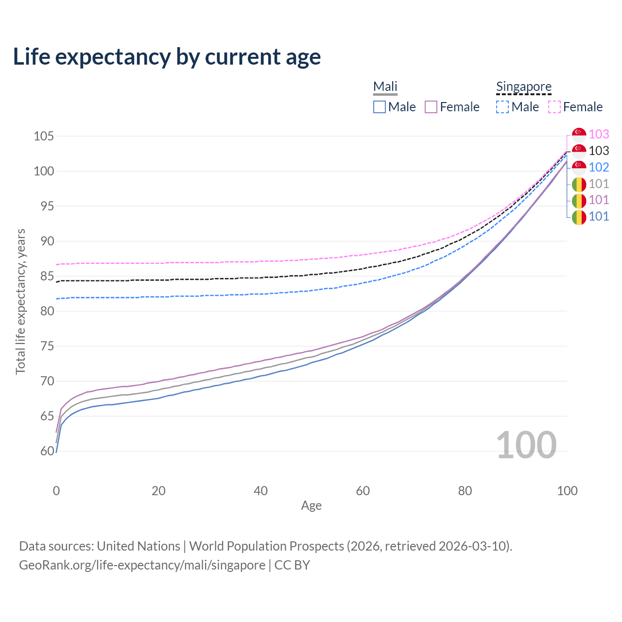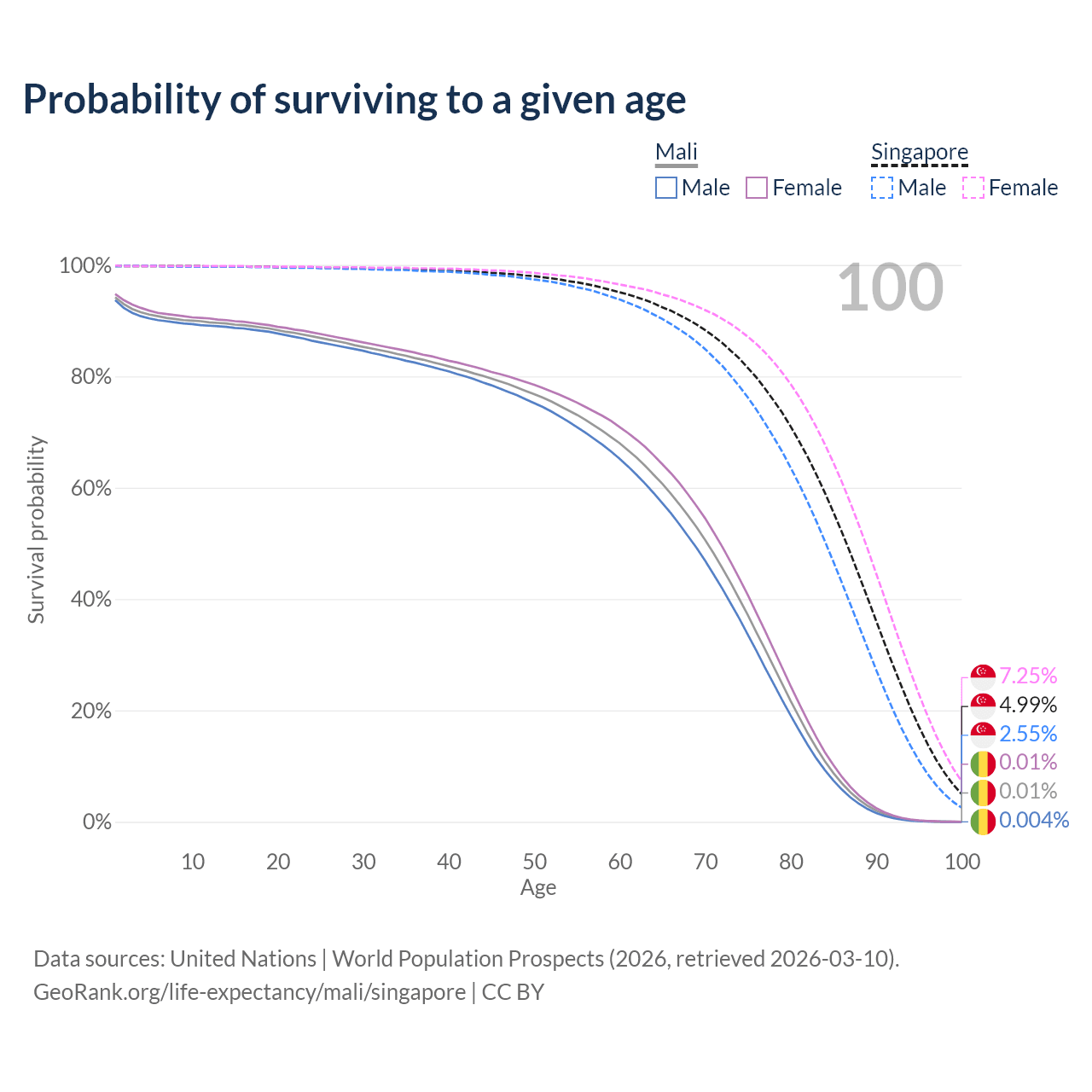 This life expectancy calculator shows the odds of living to 100, 95, 90, and below based on current age for both males and females in Mali and Singapore, along with mean and median age of death. The calculations are based on the 2026 life tables (actuarial tables) from the UN World Population Prospects.