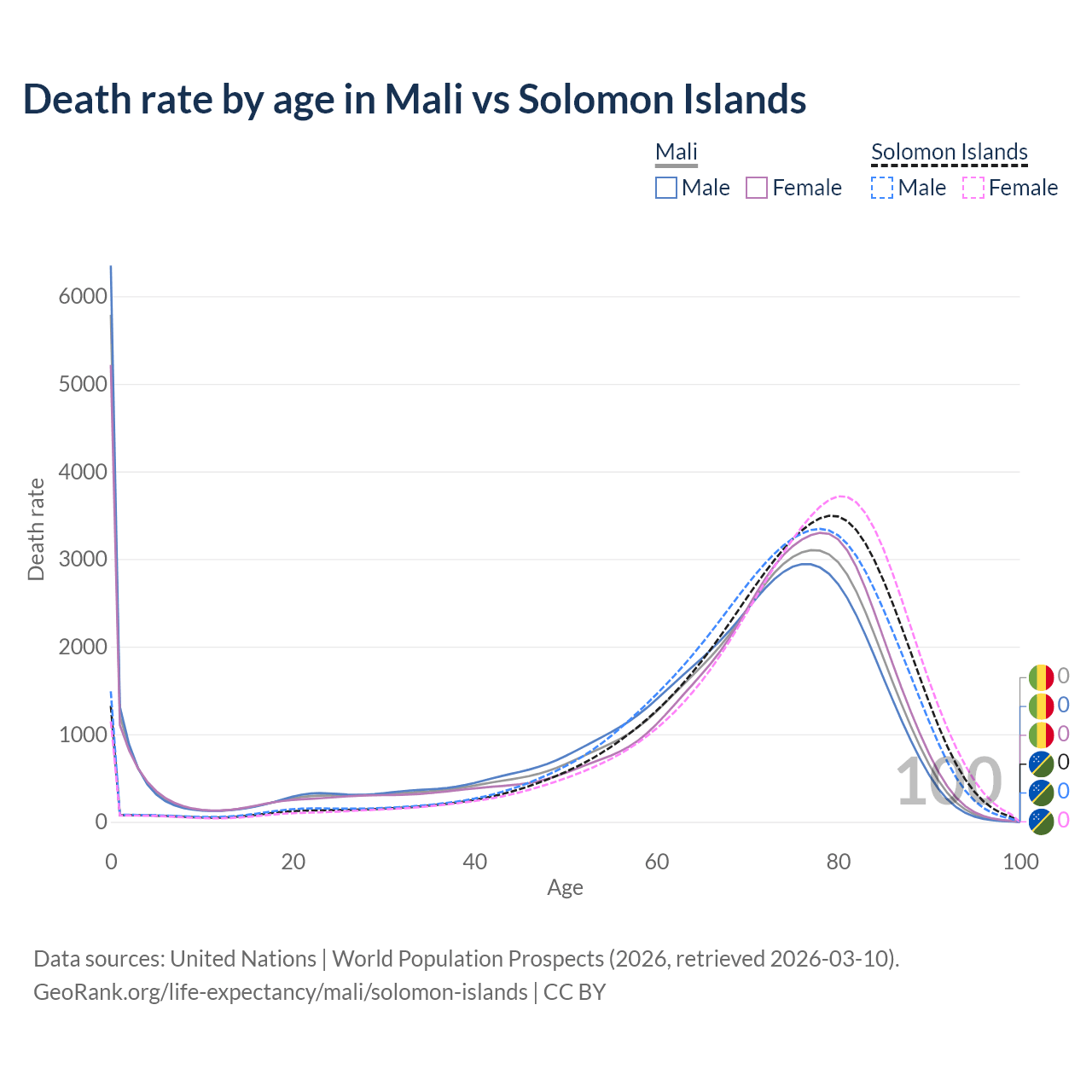 In Mali, the most common age of death is 0, compared to 79 in the Solomon Islands. The median age of death is 70.2 in Mali and 74.9 in the Solomon Islands, meaning only half of each cohort is expected to live past that age.