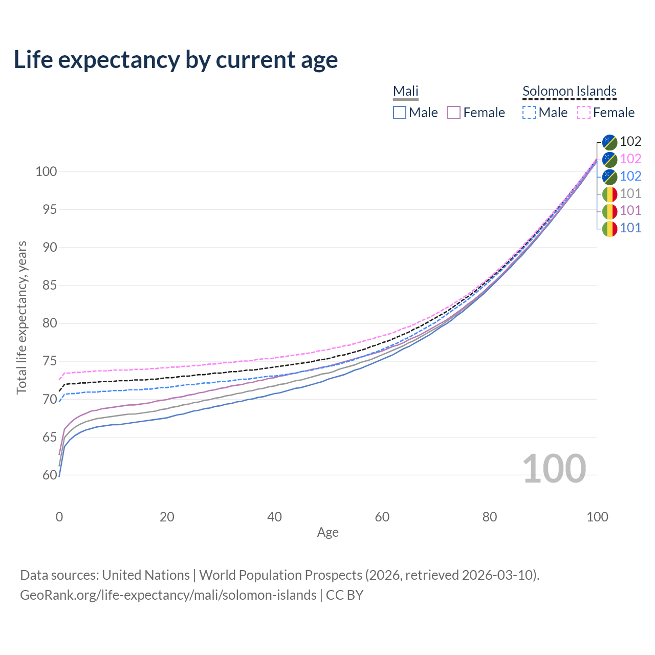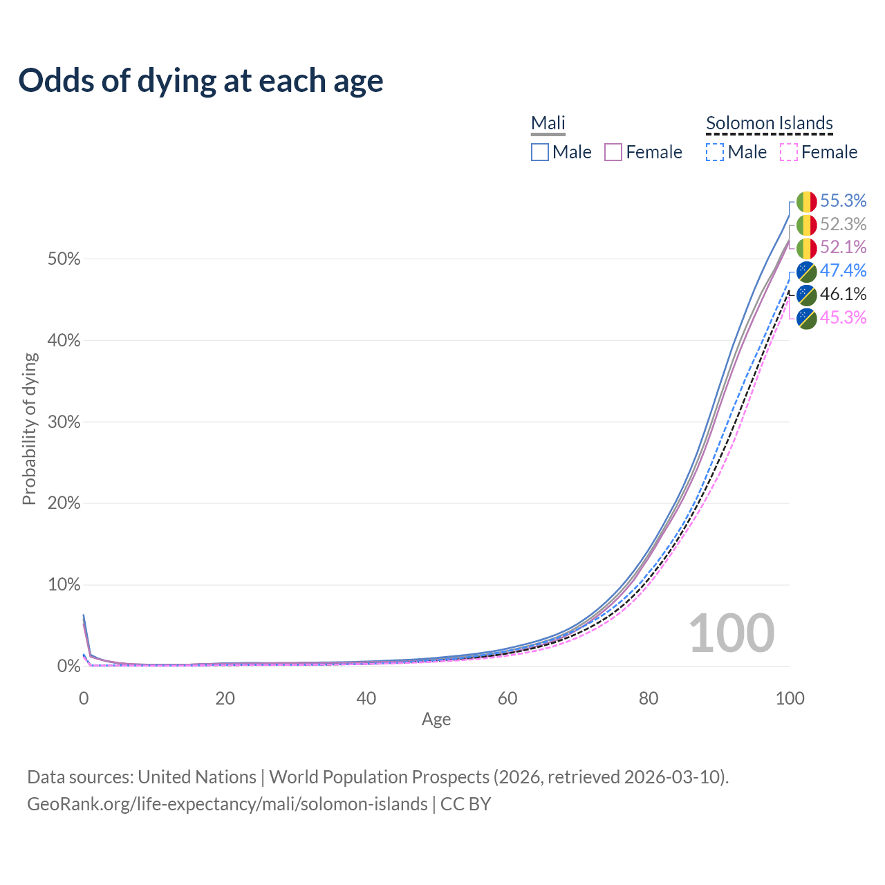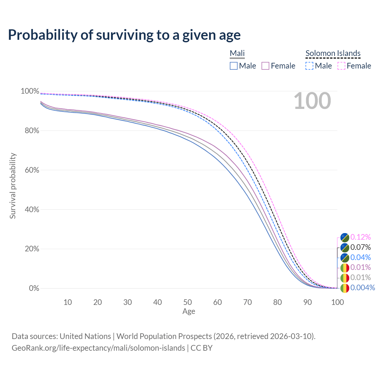 This life expectancy calculator shows the odds of living to 100, 95, 90, and below based on current age for both males and females in Mali and the Solomon Islands, along with mean and median age of death. The calculations are based on the 2026 life tables (actuarial tables) from the UN World Population Prospects.