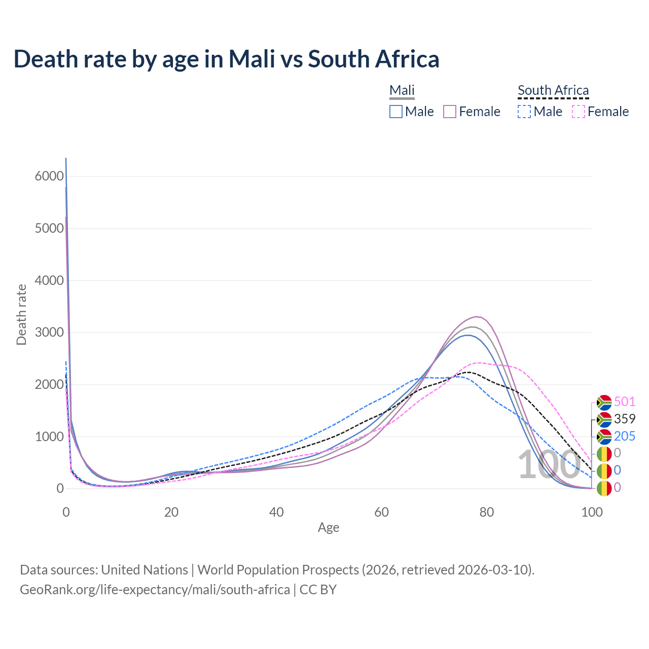The average life expectancy at birth is 61.1 years in Mali vs 66.7 in South Africa. Mali is ranked 191/197 by life expectancy, and South Africa is 164/197. In Mali, the life expectancy is 59.7 years for males and 62.6 years for females. In South Africa, it's 63.1 years for males and 70.2 years for females.