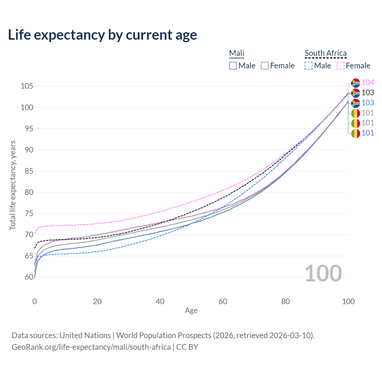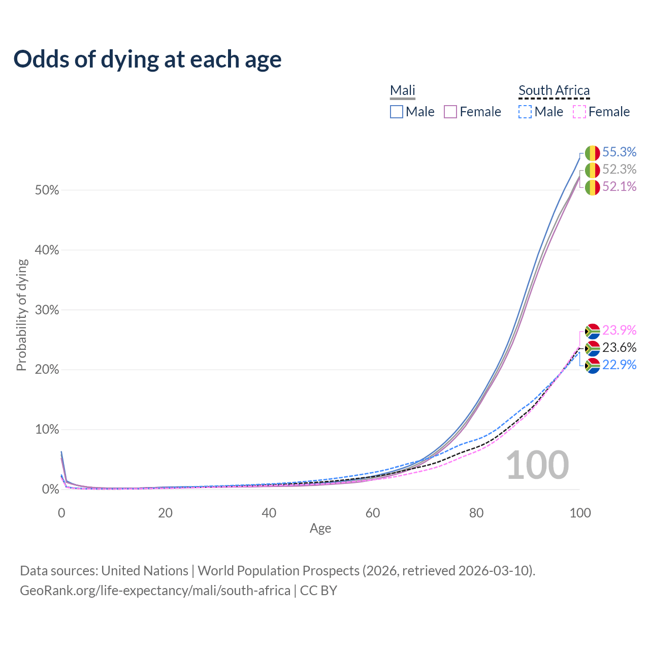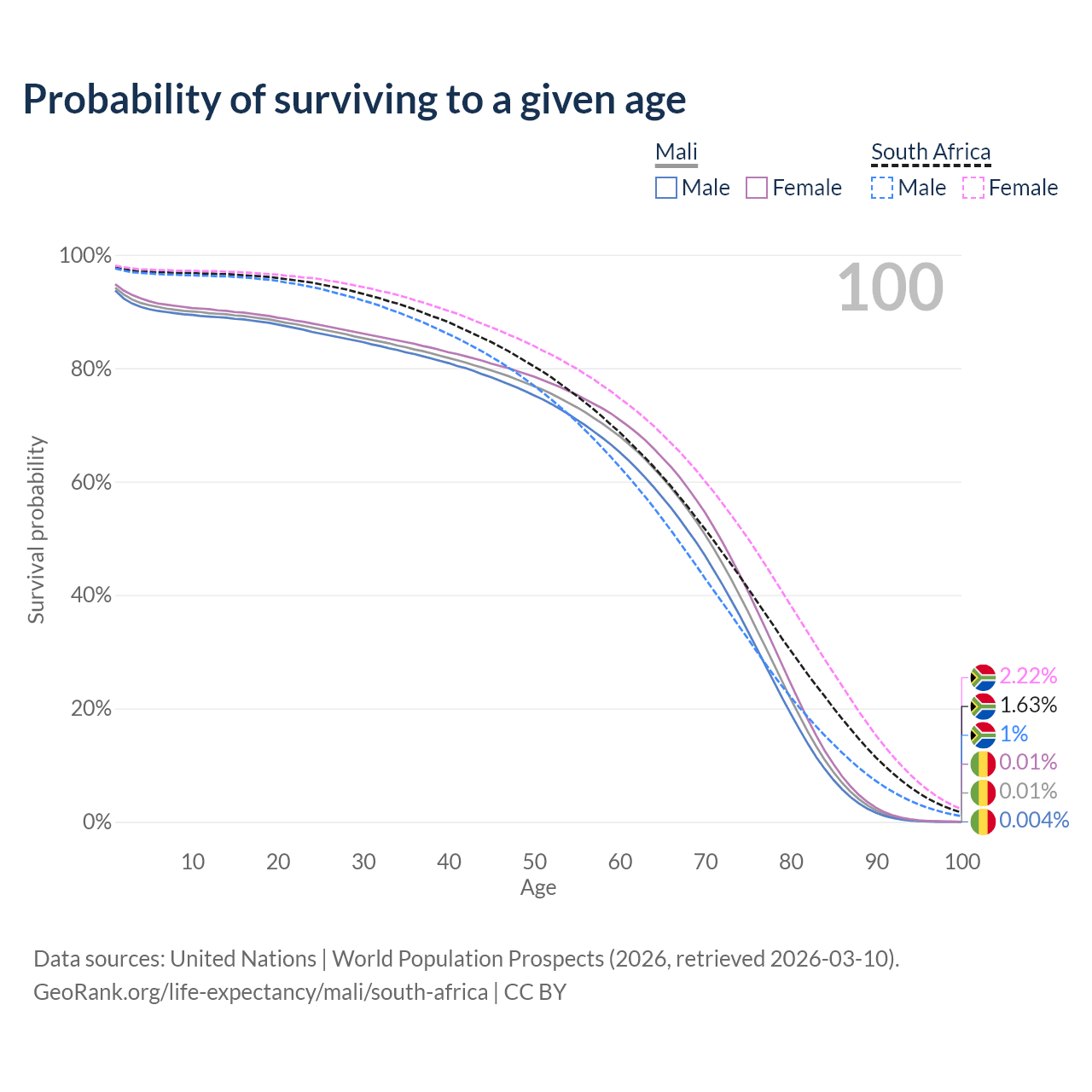This life expectancy calculator shows the odds of living to 100, 95, 90, and below based on current age for both males and females in Mali and South Africa, along with mean and median age of death. The calculations are based on the 2026 life tables (actuarial tables) from the UN World Population Prospects.
