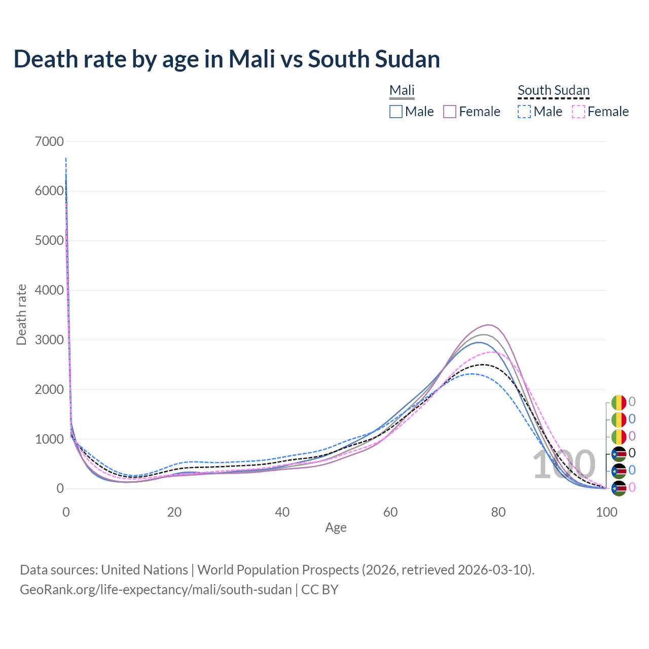 In Mali, the most common age of death is 0, compared to 0 in South Sudan. The median age of death is 70.2 in Mali and 67.5 in South Sudan, meaning only half of each cohort is expected to live past that age.