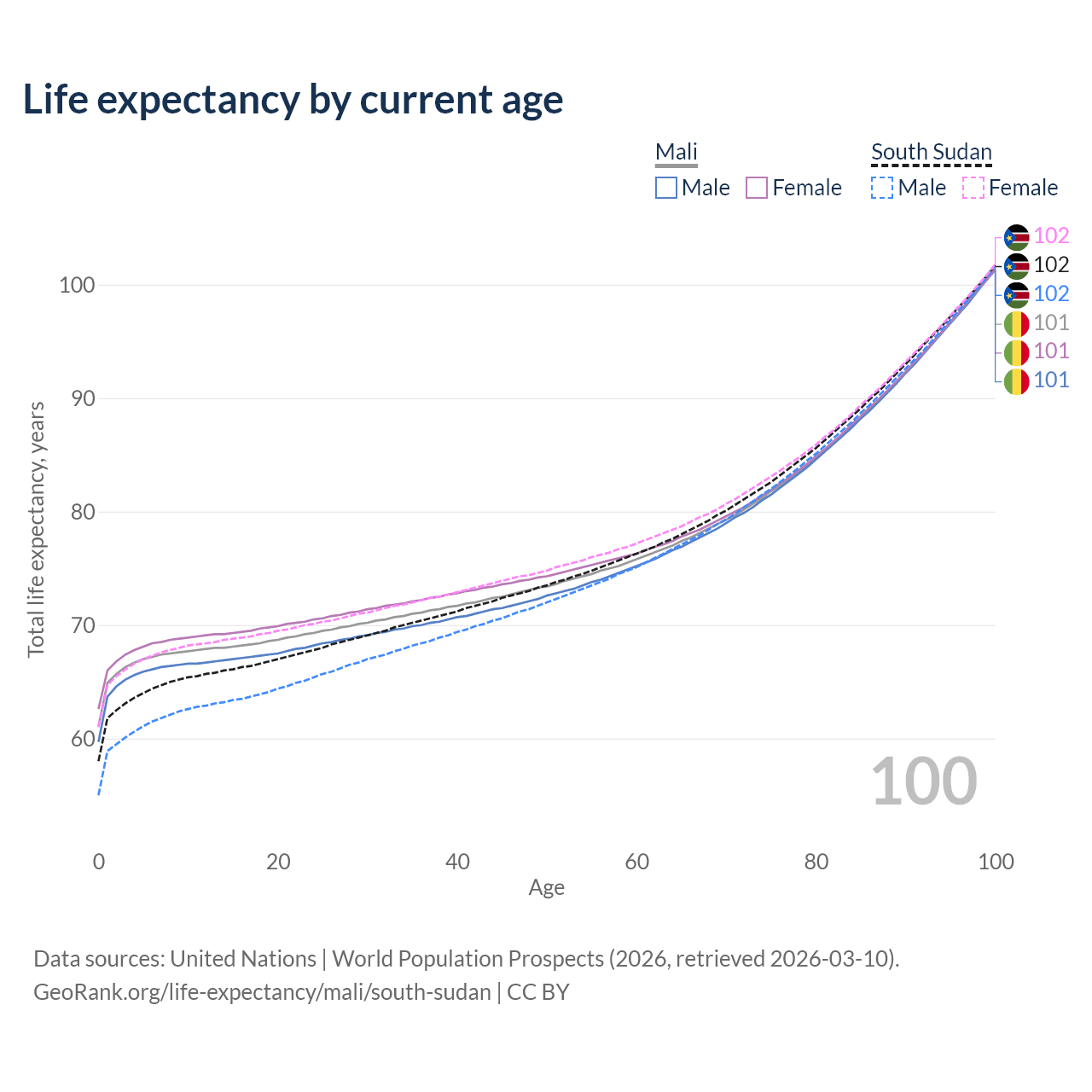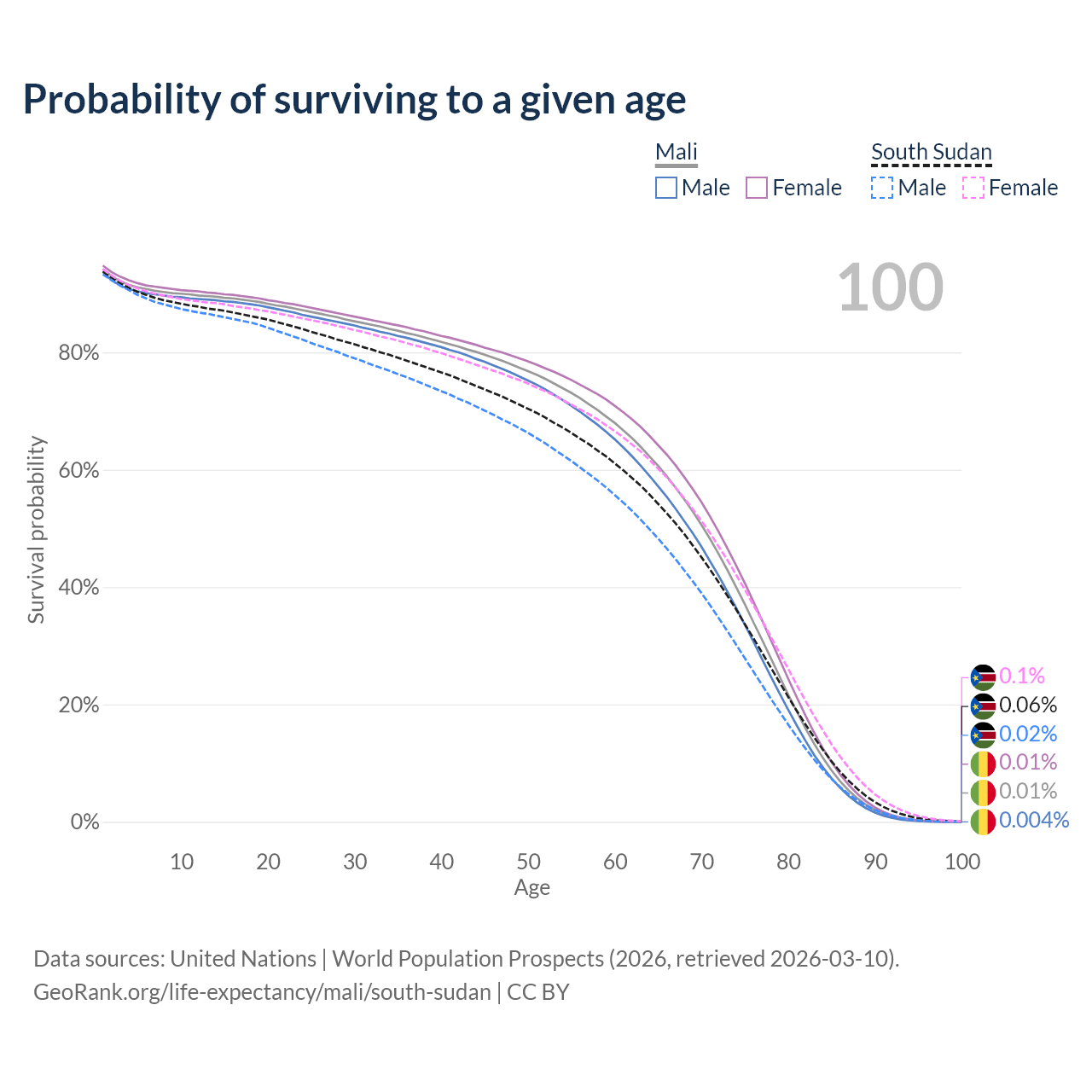 This life expectancy calculator shows the odds of living to 100, 95, 90, and below based on current age for both males and females in Mali and South Sudan, along with mean and median age of death. The calculations are based on the 2026 life tables (actuarial tables) from the UN World Population Prospects.