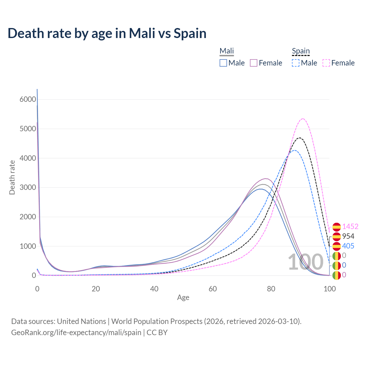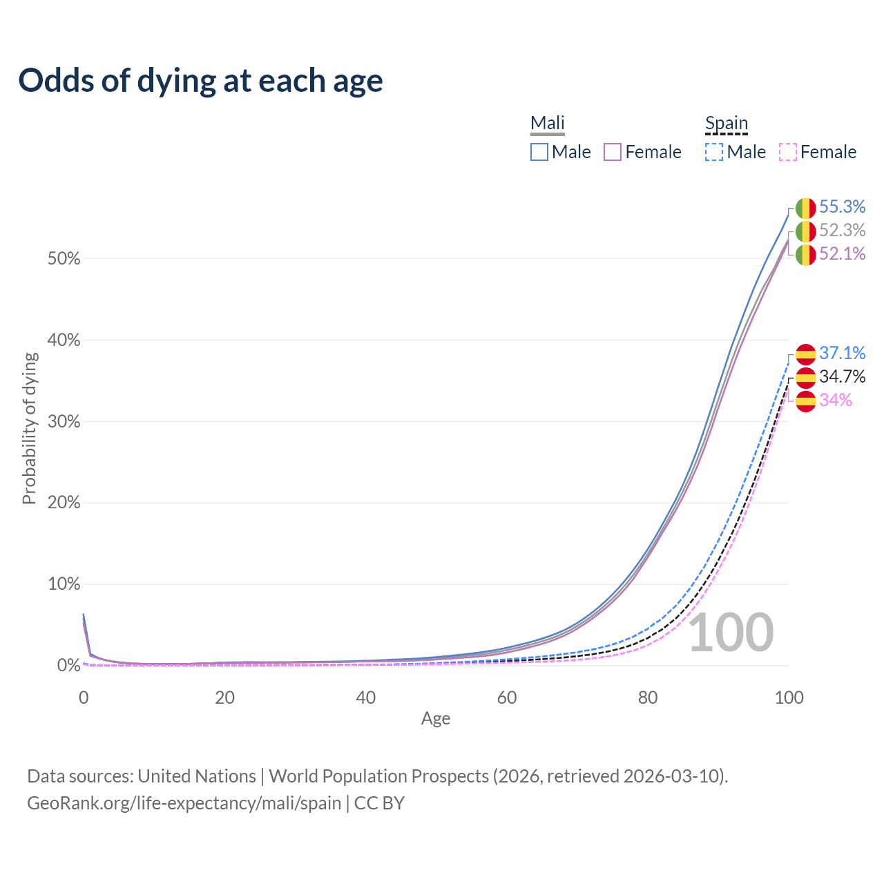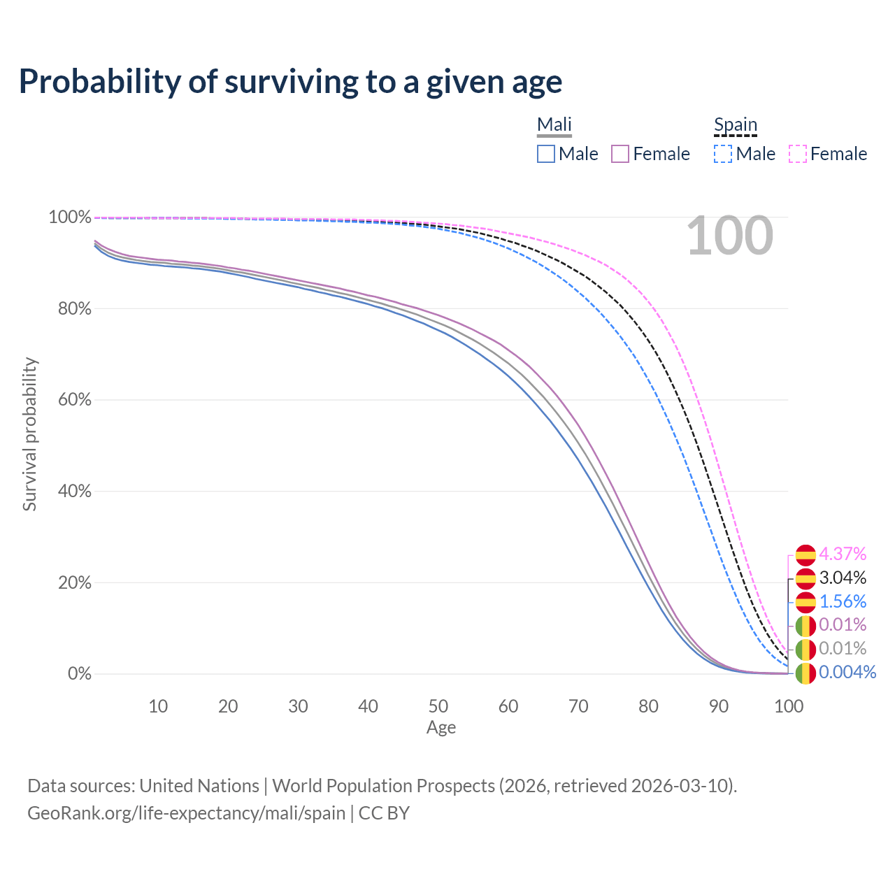 This life expectancy calculator shows the odds of living to 100, 95, 90, and below based on current age for both males and females in Mali and Spain, along with mean and median age of death. The calculations are based on the 2026 life tables (actuarial tables) from the UN World Population Prospects.