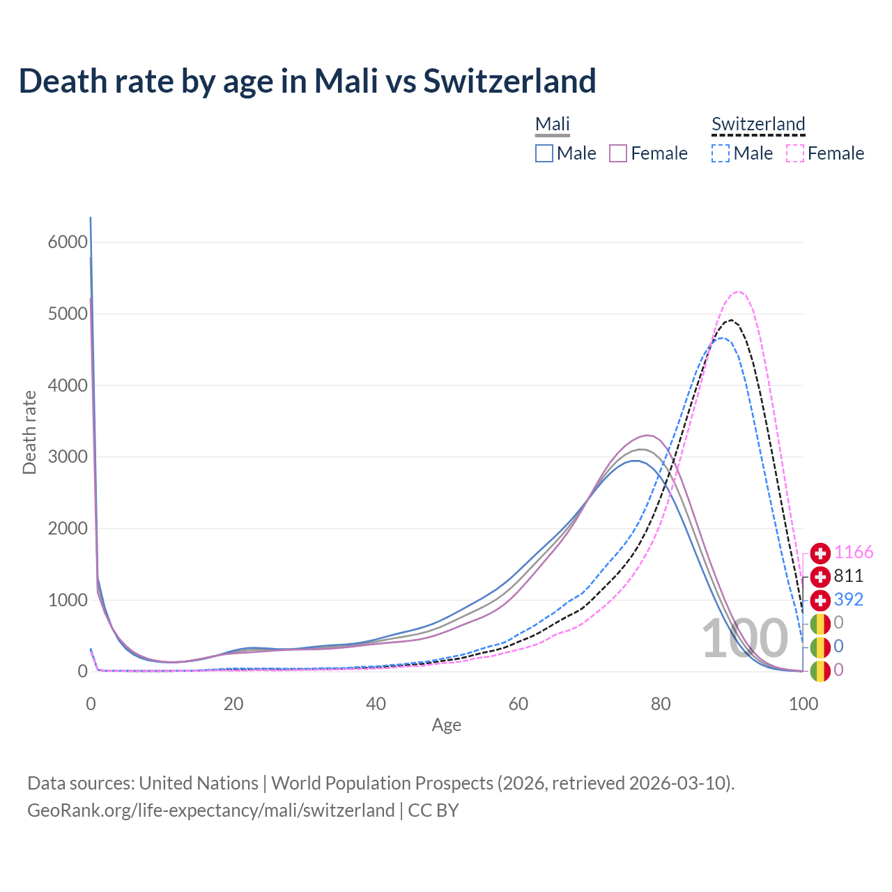 In Mali, the most common age of death is 0, compared to 90 in Switzerland. The median age of death is 70.2 in Mali and 87.2 in Switzerland, meaning only half of each cohort is expected to live past that age.