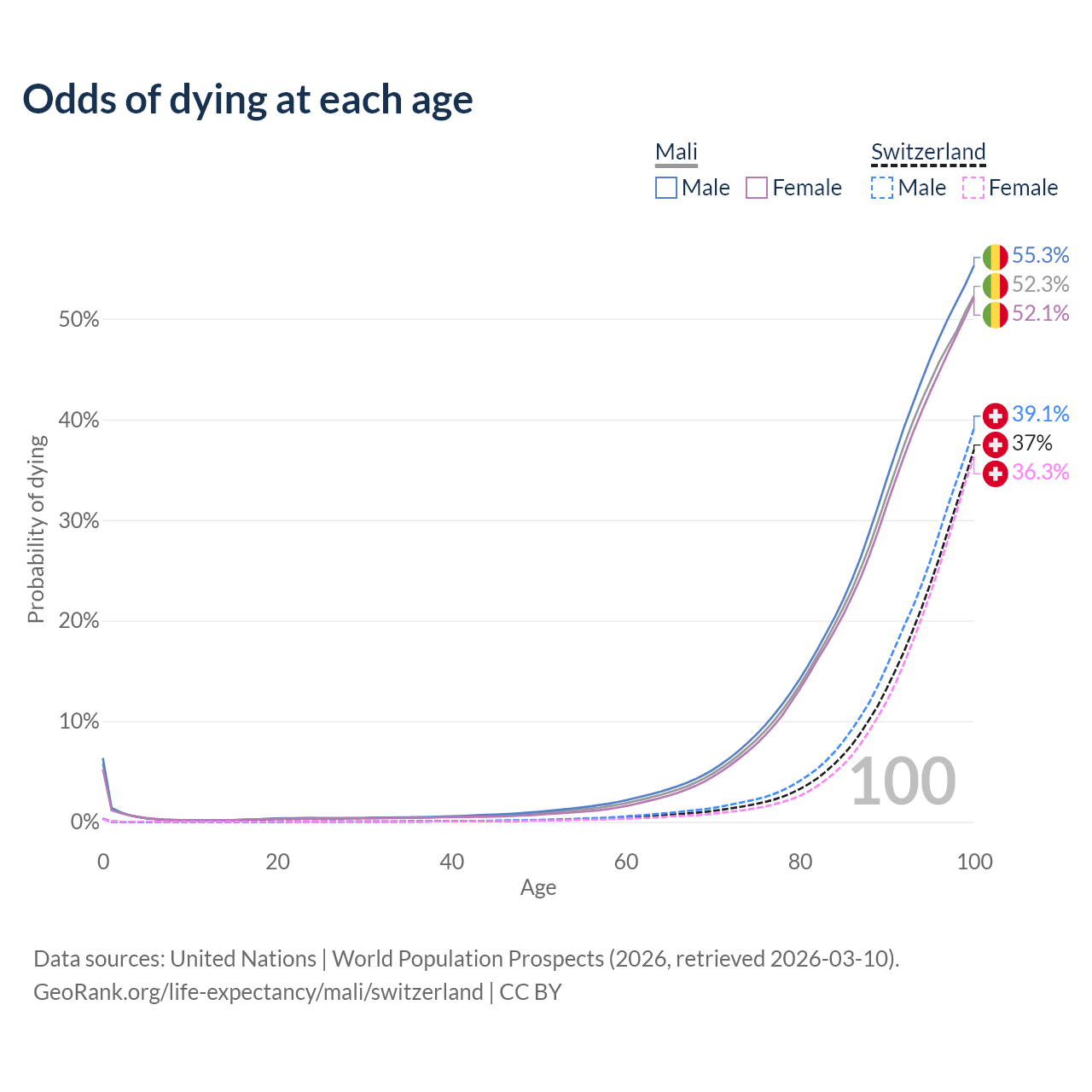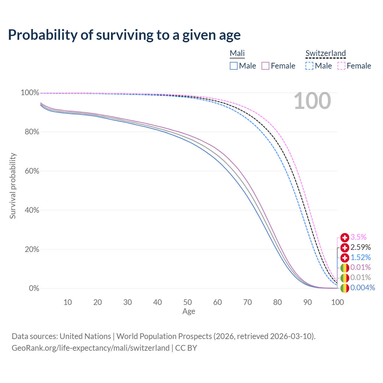This life expectancy calculator shows the odds of living to 100, 95, 90, and below based on current age for both males and females in Mali and Switzerland, along with mean and median age of death. The calculations are based on the 2026 life tables (actuarial tables) from the UN World Population Prospects.