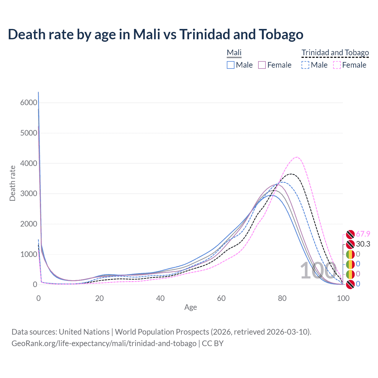 In Mali, the most common age of death is 0, compared to 83 in Trinidad and Tobago. The median age of death is 70.2 in Mali and 78.4 in Trinidad and Tobago, meaning only half of each cohort is expected to live past that age.