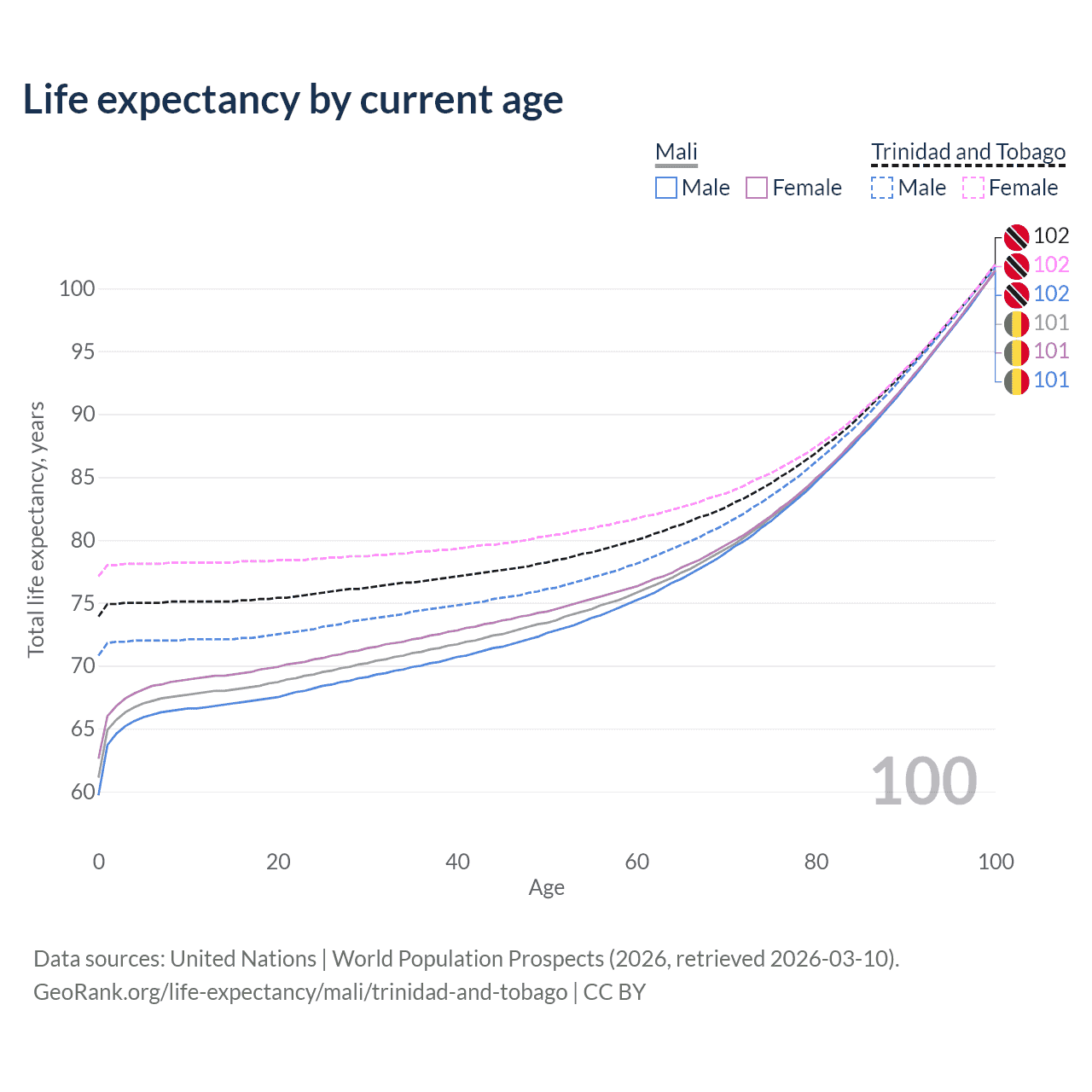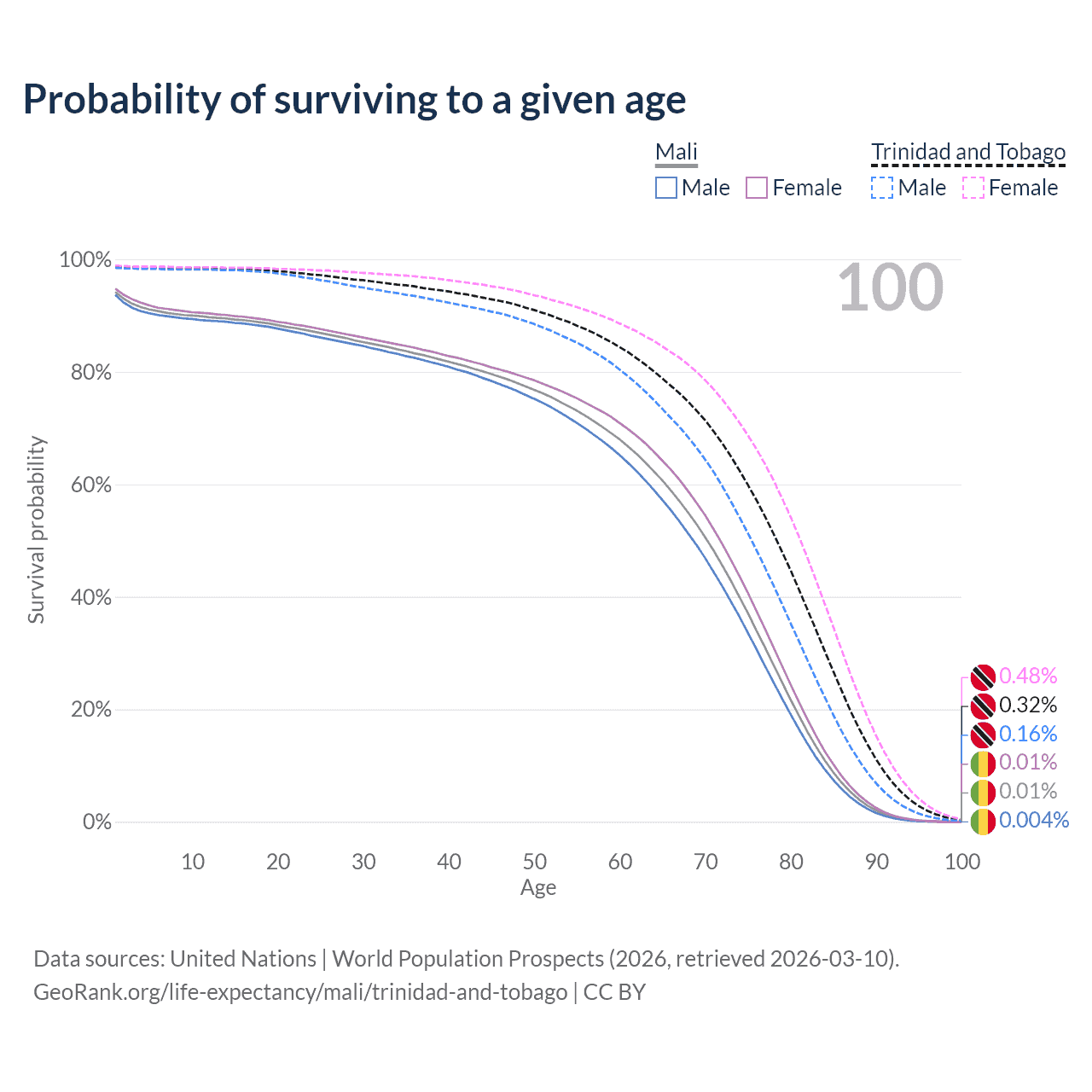 This life expectancy calculator shows the odds of living to 100, 95, 90, and below based on current age for both males and females in Mali and Trinidad and Tobago, along with mean and median age of death. The calculations are based on the 2026 life tables (actuarial tables) from the UN World Population Prospects.