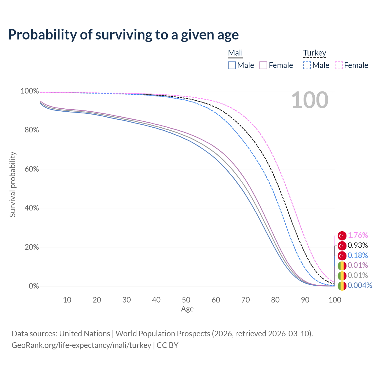 This life expectancy calculator shows the odds of living to 100, 95, 90, and below based on current age for both males and females in Mali and Turkey, along with mean and median age of death. The calculations are based on the 2026 life tables (actuarial tables) from the UN World Population Prospects.