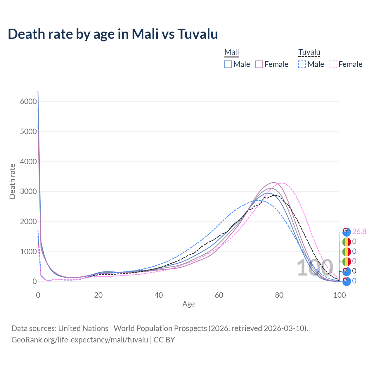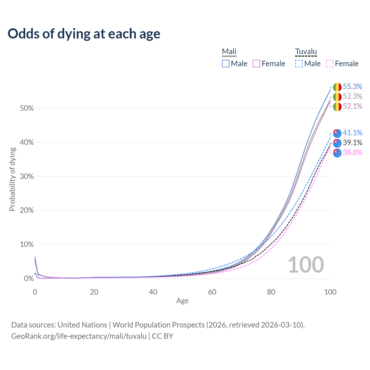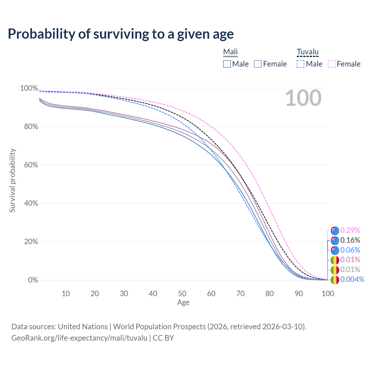 This life expectancy calculator shows the odds of living to 100, 95, 90, and below based on current age for both males and females in Mali and Tuvalu, along with mean and median age of death. The calculations are based on the 2026 life tables (actuarial tables) from the UN World Population Prospects.