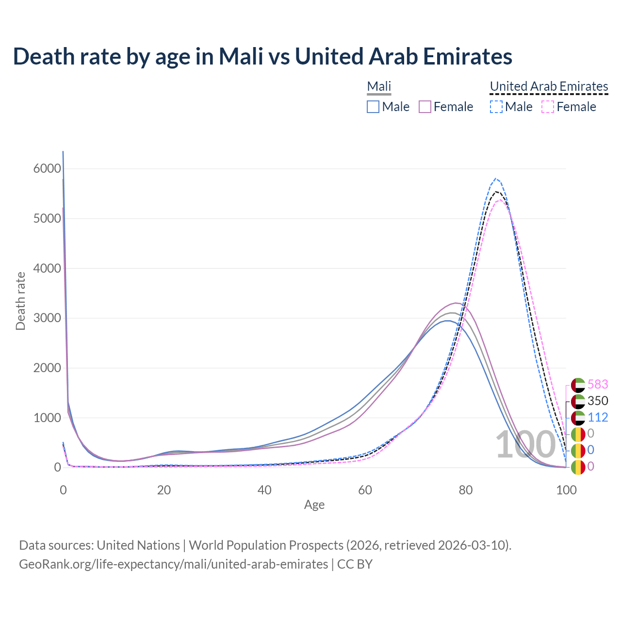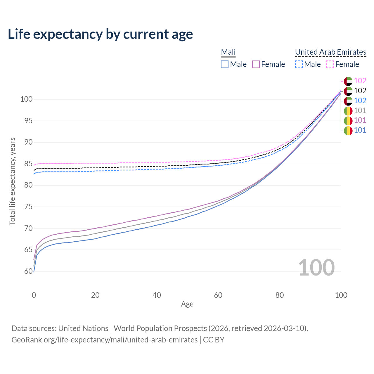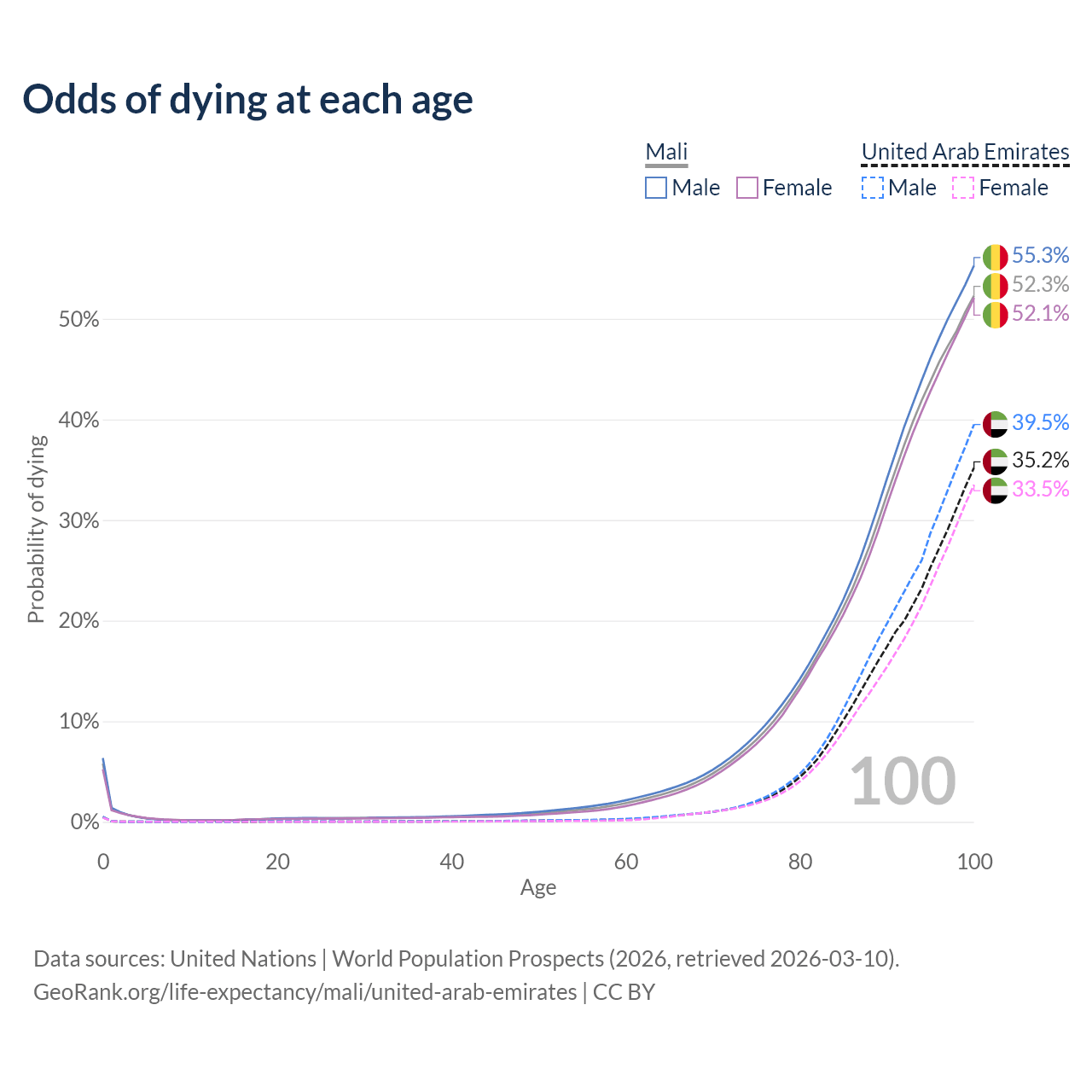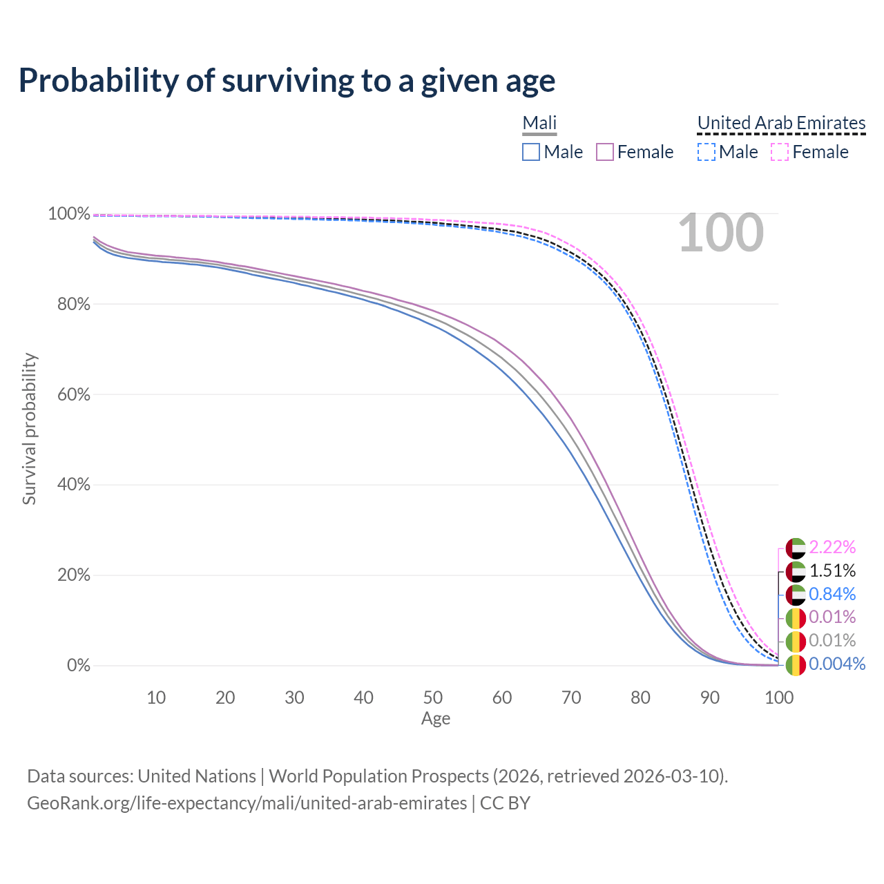 This life expectancy calculator shows the odds of living to 100, 95, 90, and below based on current age for both males and females in Mali and the United Arab Emirates, along with mean and median age of death. The calculations are based on the 2026 life tables (actuarial tables) from the UN World Population Prospects.