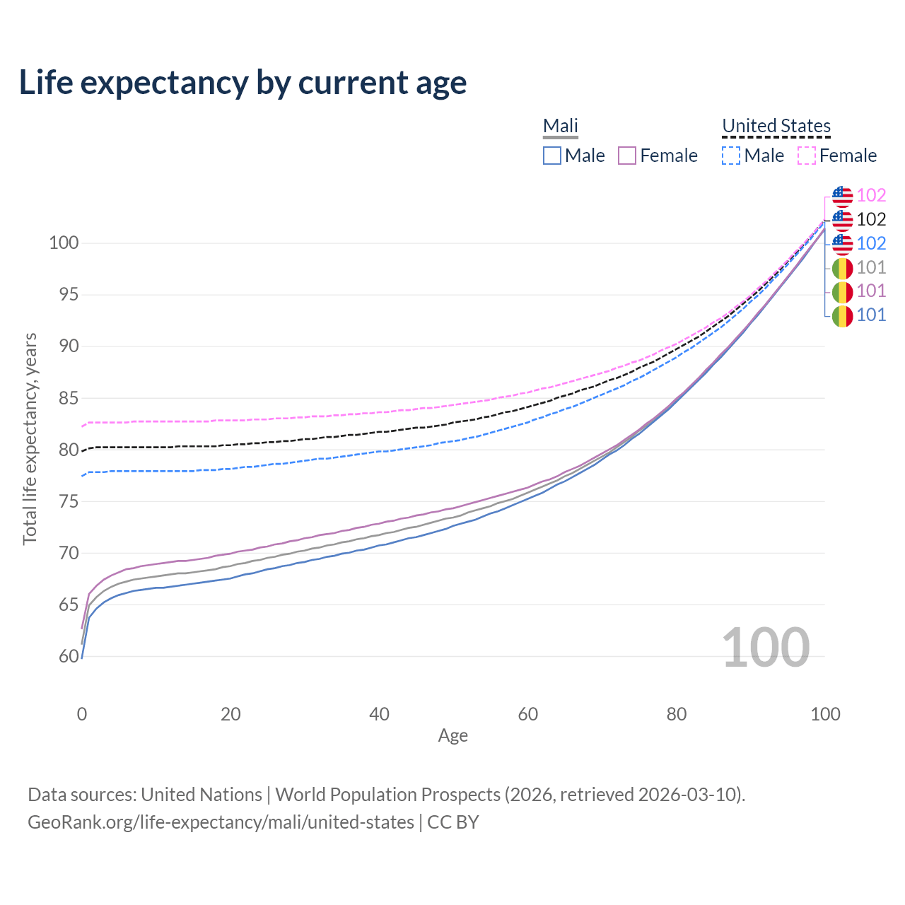 This life expectancy calculator shows the odds of living to 100, 95, 90, and below based on current age for both males and females in Mali and the United States, along with mean and median age of death. The calculations are based on the 2026 life tables (actuarial tables) from the UN World Population Prospects.