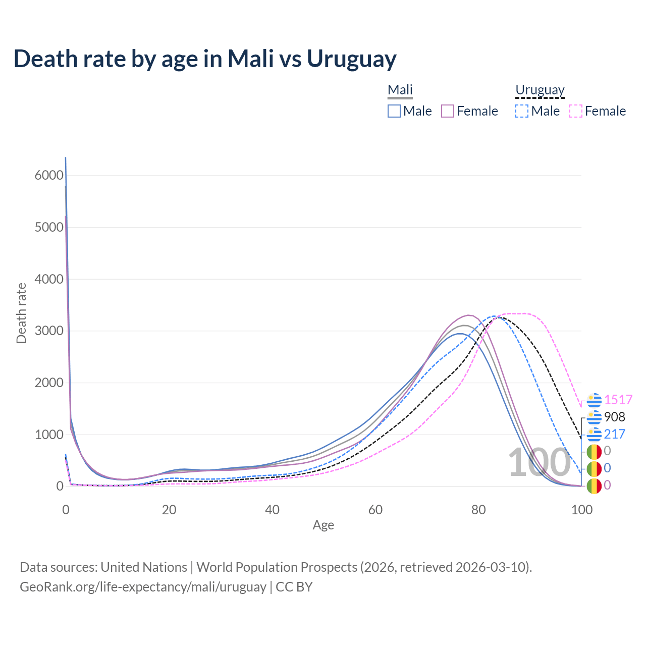 In Mali, the most common age of death is 0, compared to 84 in Uruguay. The median age of death is 70.2 in Mali and 81.8 in Uruguay, meaning only half of each cohort is expected to live past that age.