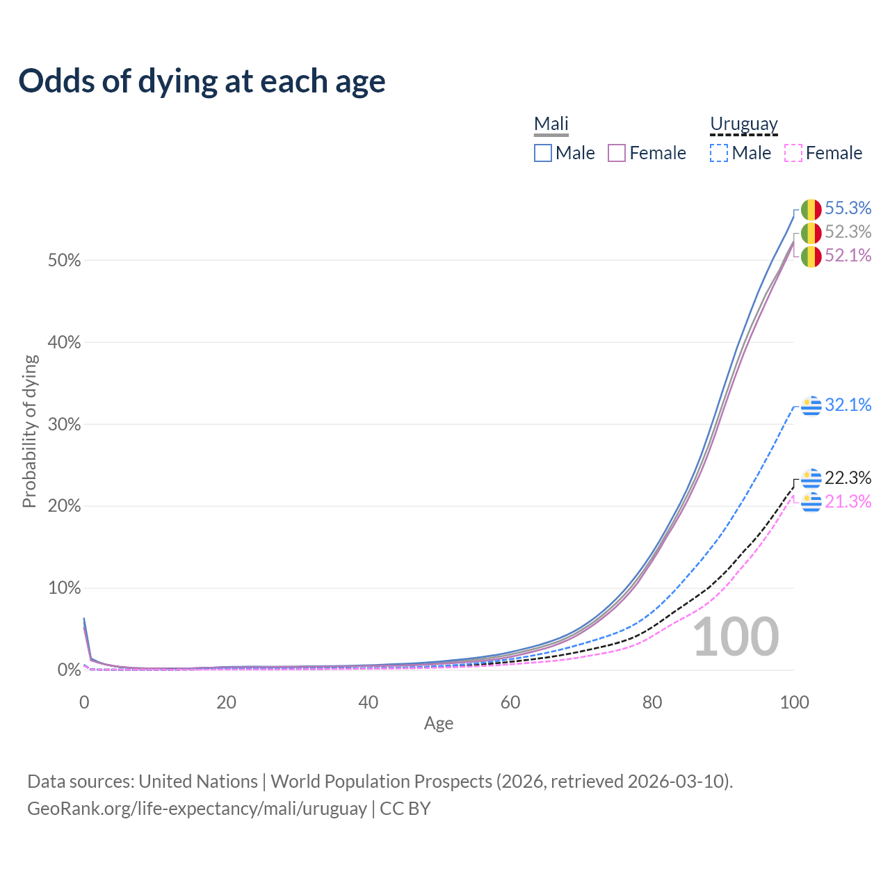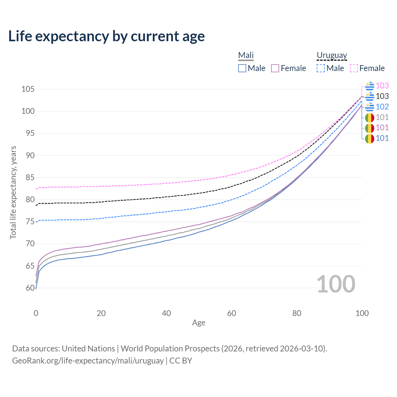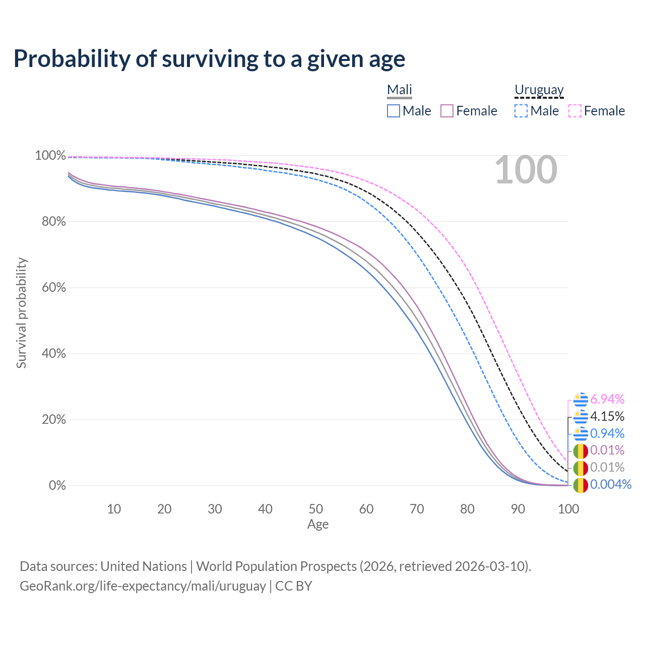 This life expectancy calculator shows the odds of living to 100, 95, 90, and below based on current age for both males and females in Mali and Uruguay, along with mean and median age of death. The calculations are based on the 2026 life tables (actuarial tables) from the UN World Population Prospects.