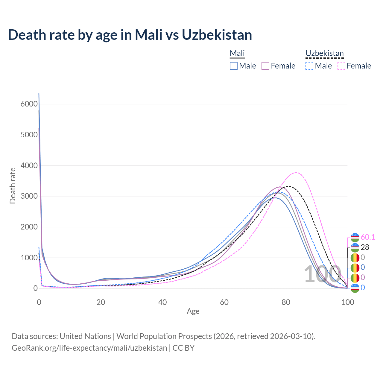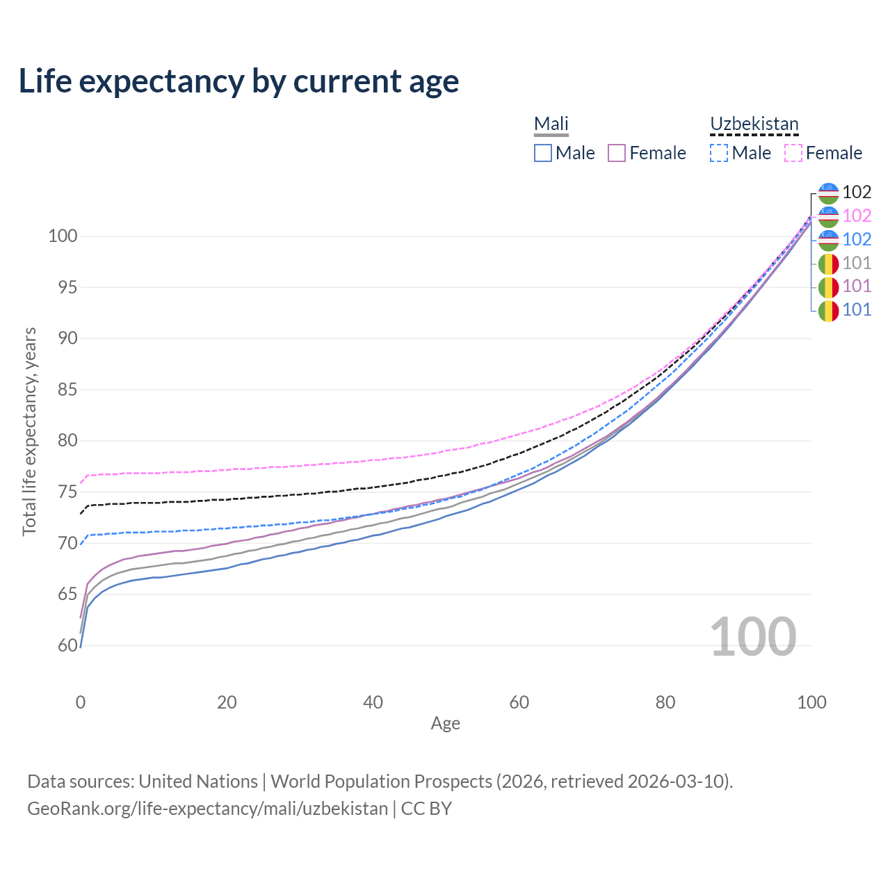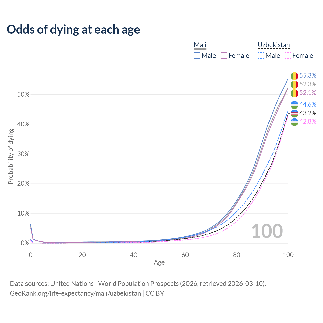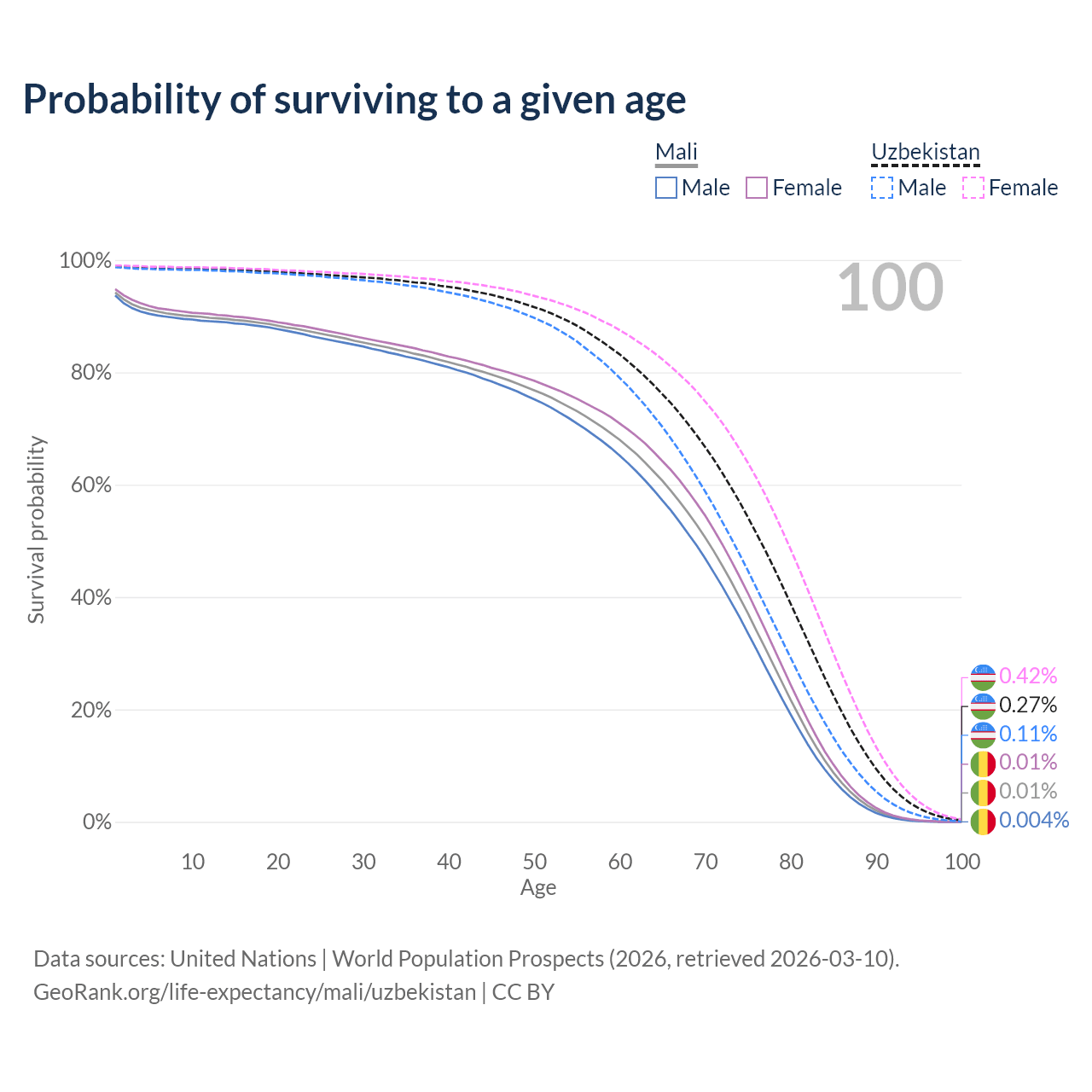 This life expectancy calculator shows the odds of living to 100, 95, 90, and below based on current age for both males and females in Mali and Uzbekistan, along with mean and median age of death. The calculations are based on the 2026 life tables (actuarial tables) from the UN World Population Prospects.