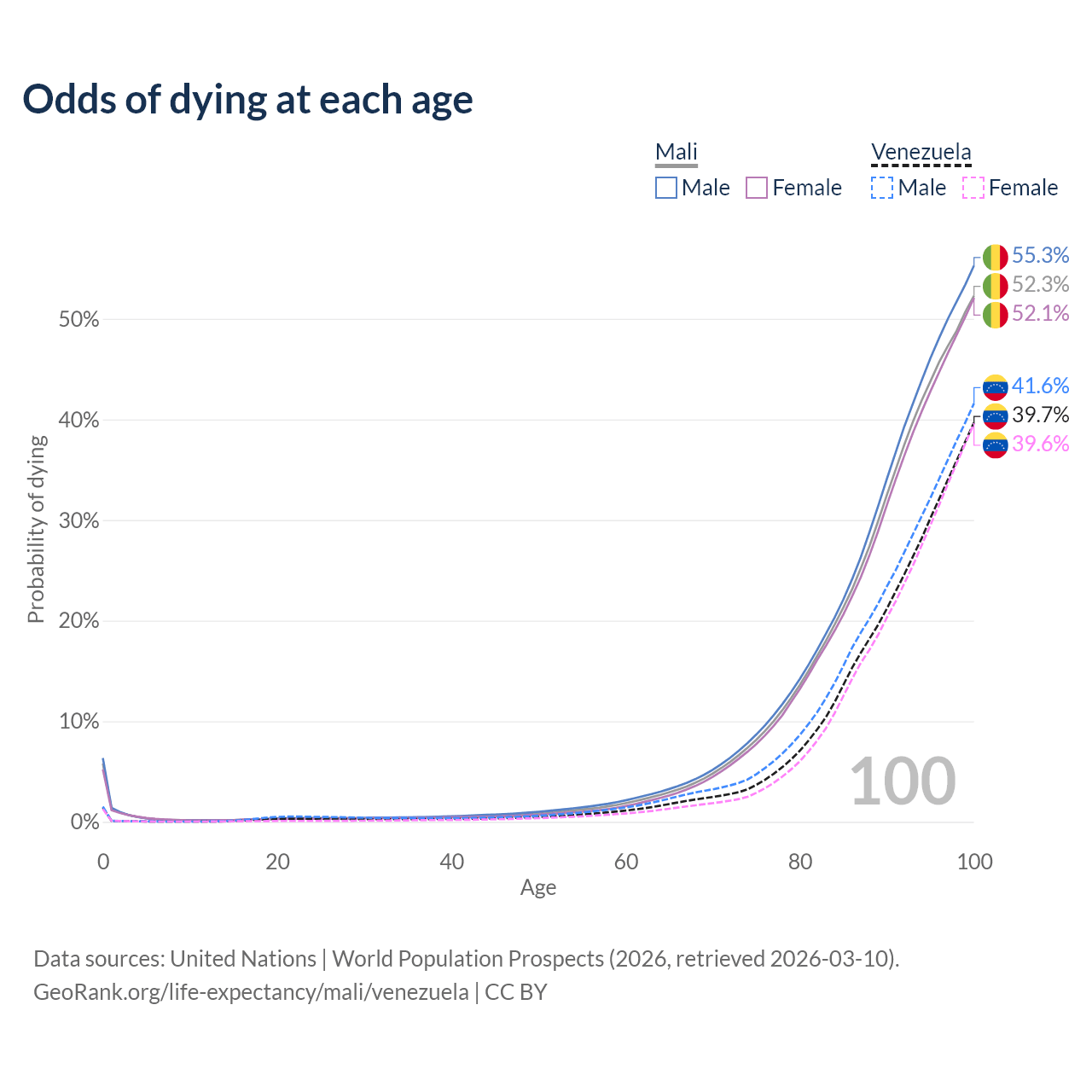 This life expectancy calculator shows the odds of living to 100, 95, 90, and below based on current age for both males and females in Mali and Venezuela, along with mean and median age of death. The calculations are based on the 2026 life tables (actuarial tables) from the UN World Population Prospects.